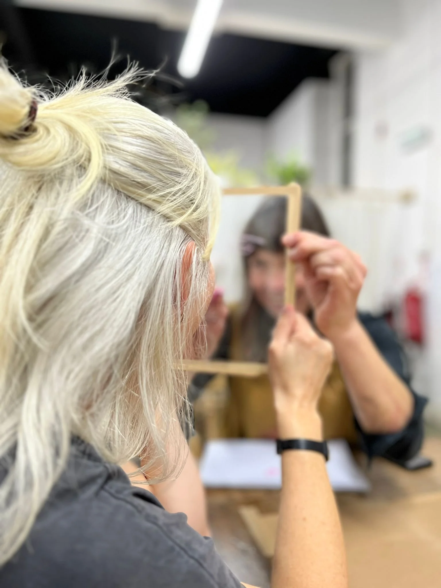 A woman with blonde hair looking into a small hand mirror, which she is holding, reflecting her face. She is sitting at a wooden table in a casual setting.