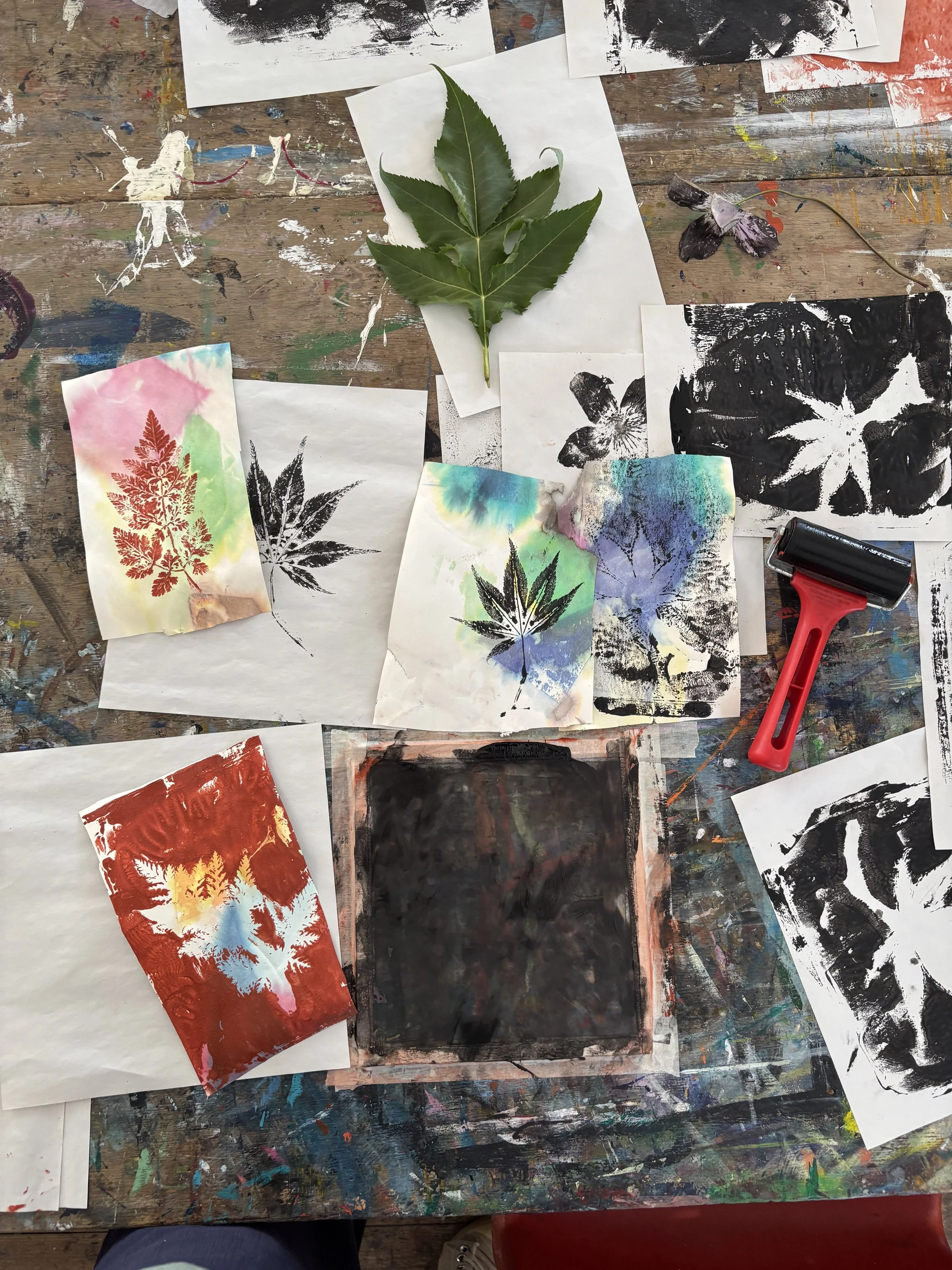 A messy wooden table covered with art supplies, featuring multiple paper prints of leaves, some painted with bright colors, a real green leaf, and a red-bristled ink roller.
