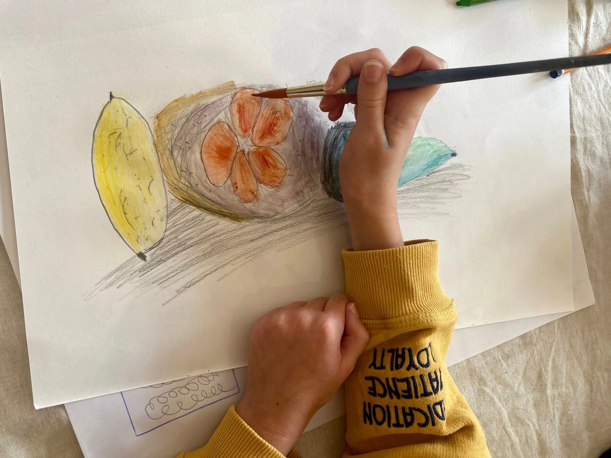 Child's hand coloring a drawing of a banana, a peeled orange, and an ice cream cone on paper with colored pencils.