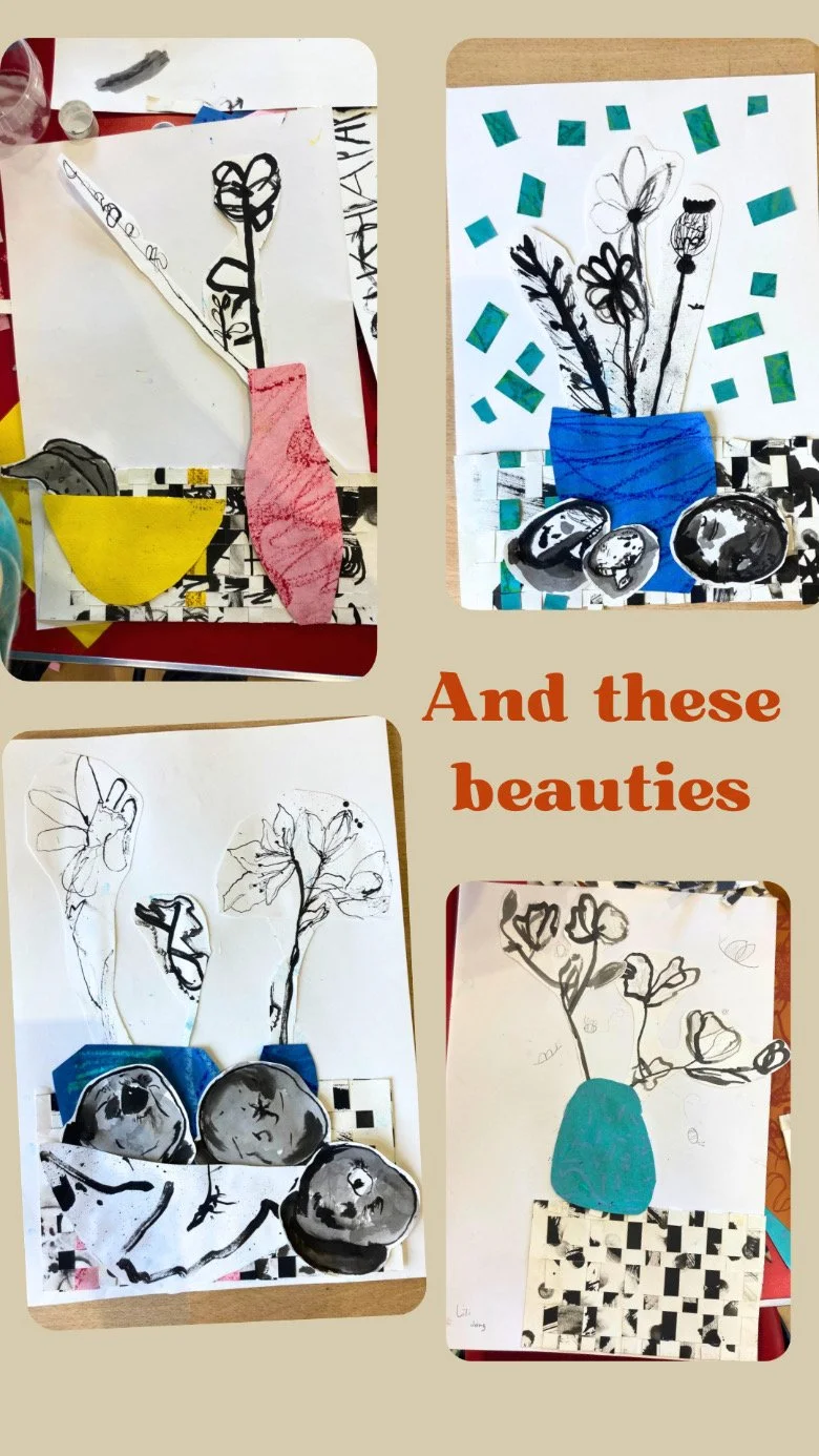 Collection of children's art projects depicting vases with flowers, created from cut paper and drawings, accented with various geometric shapes and collaged elements.