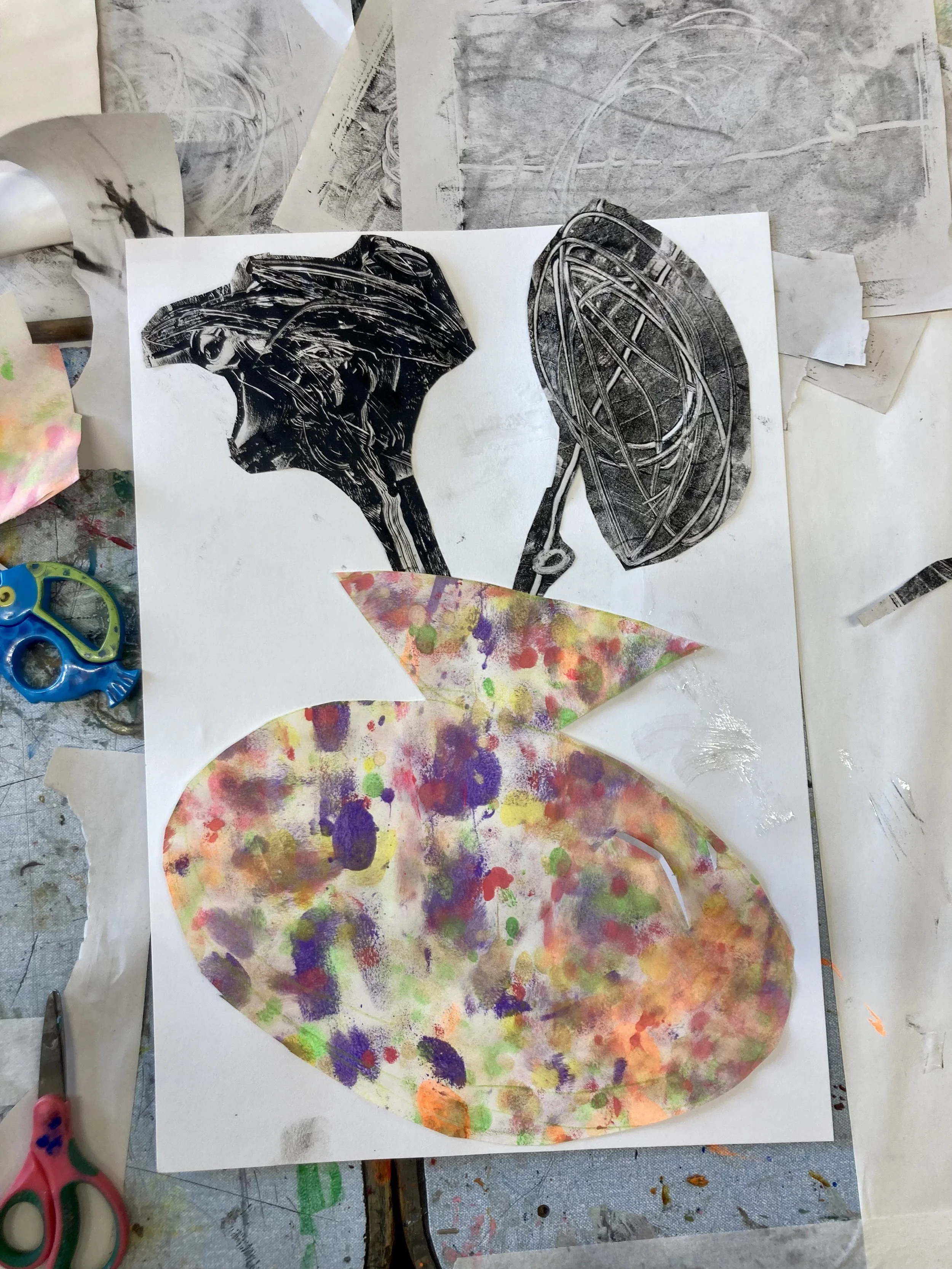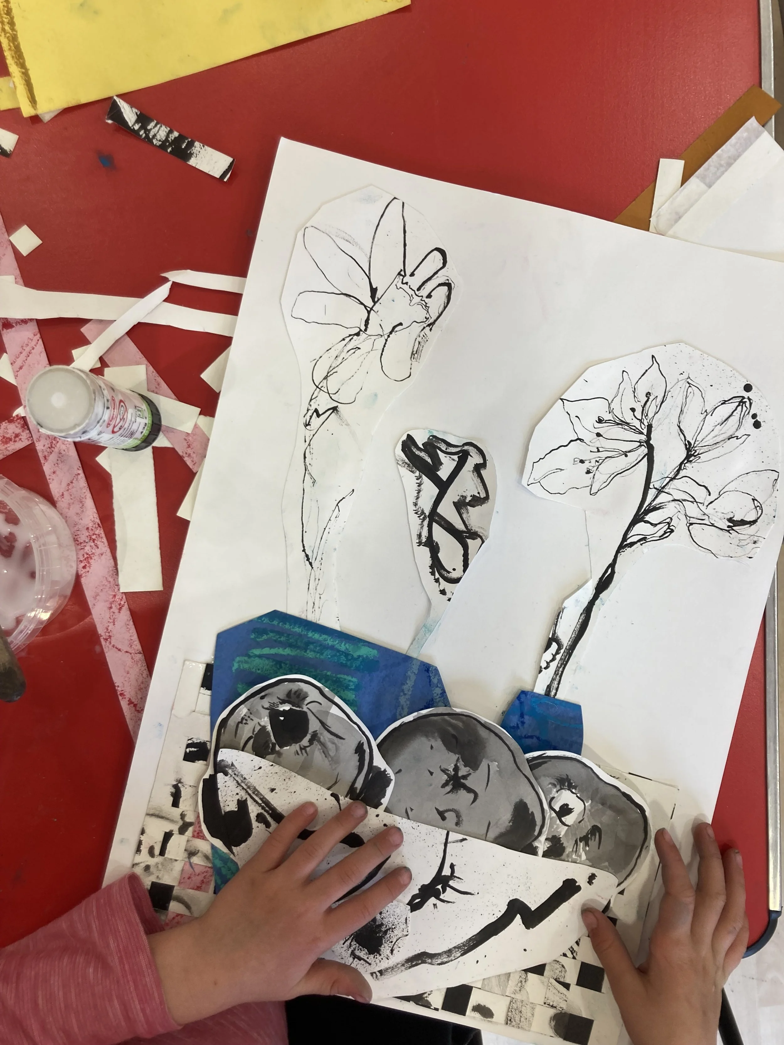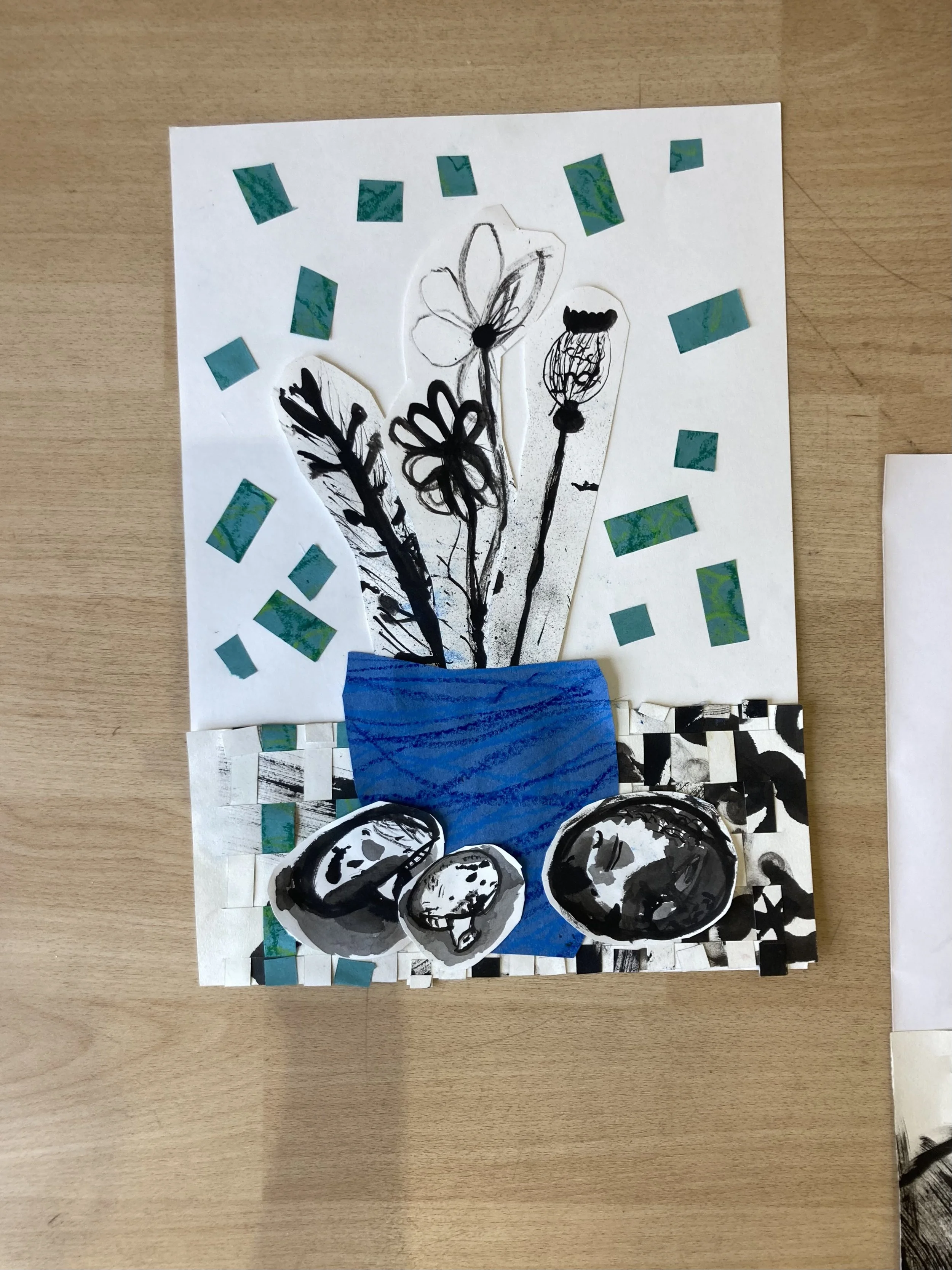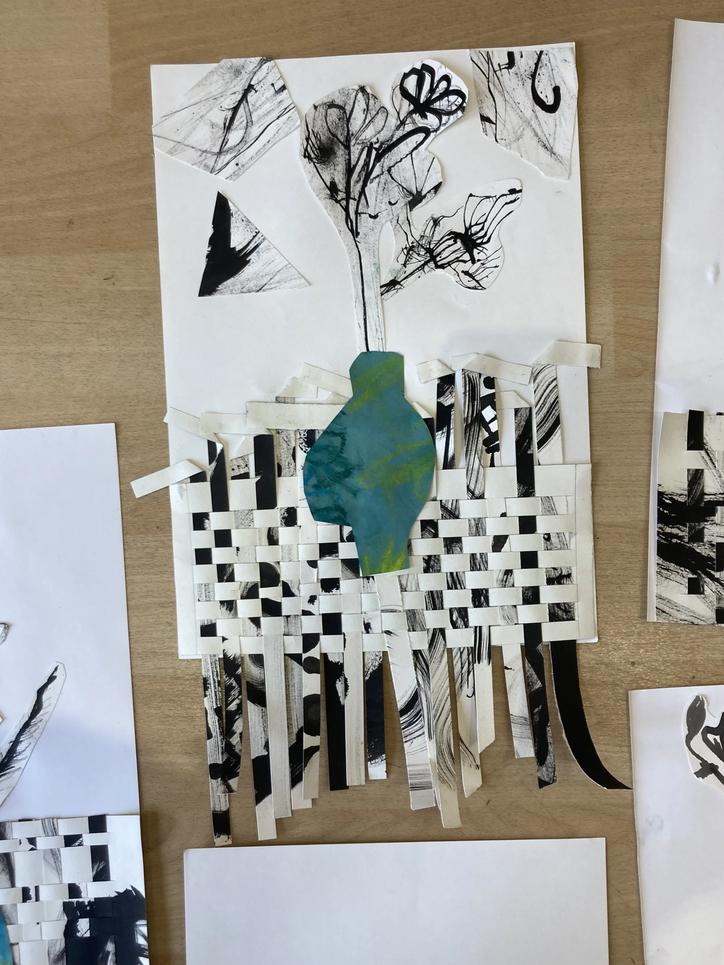 Mixed media collage art featuring a painted blue vase with a plant, cut-out paper elements, and a woven black and white basket pattern on white paper with black ink drawings of flowers in the background.