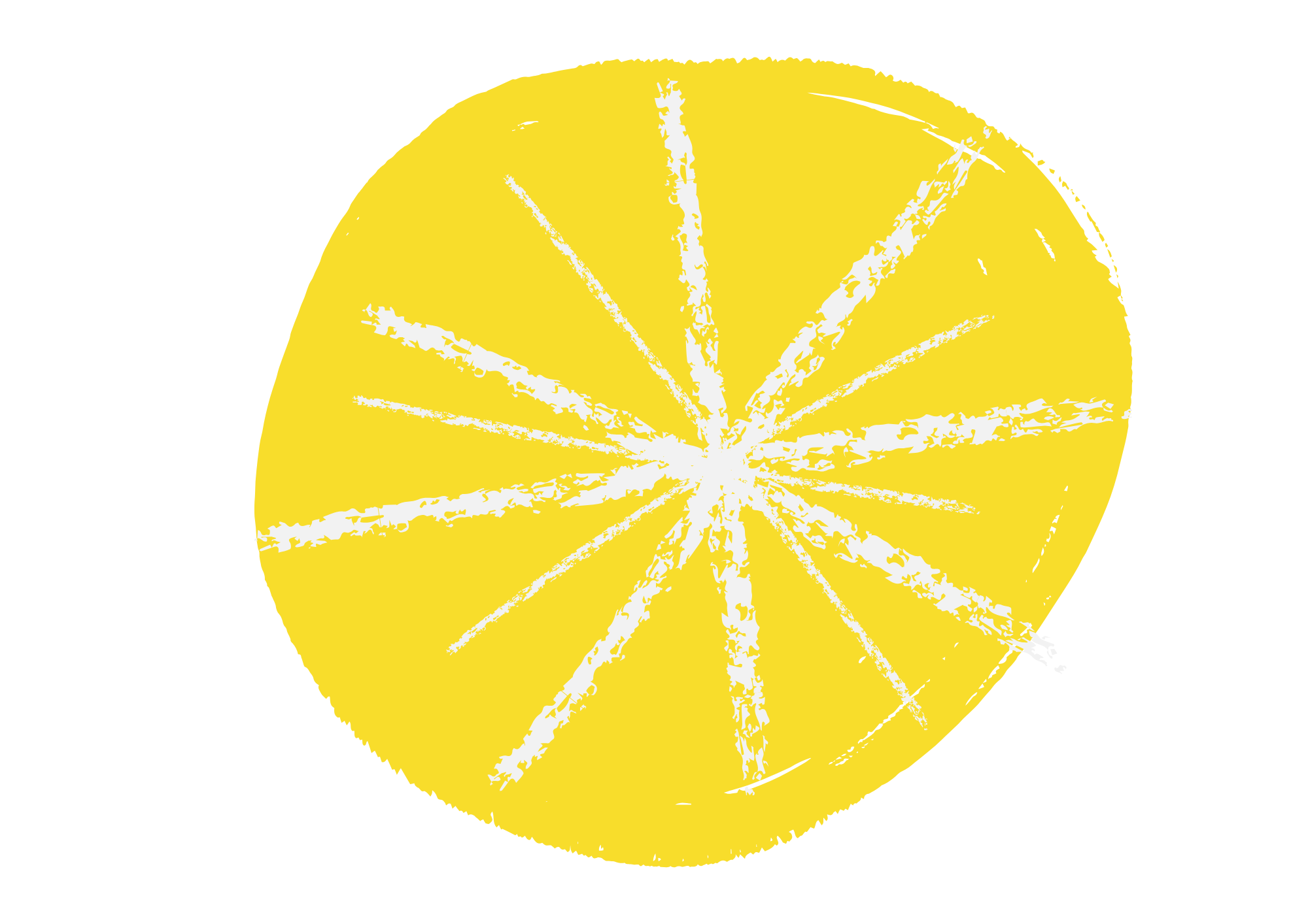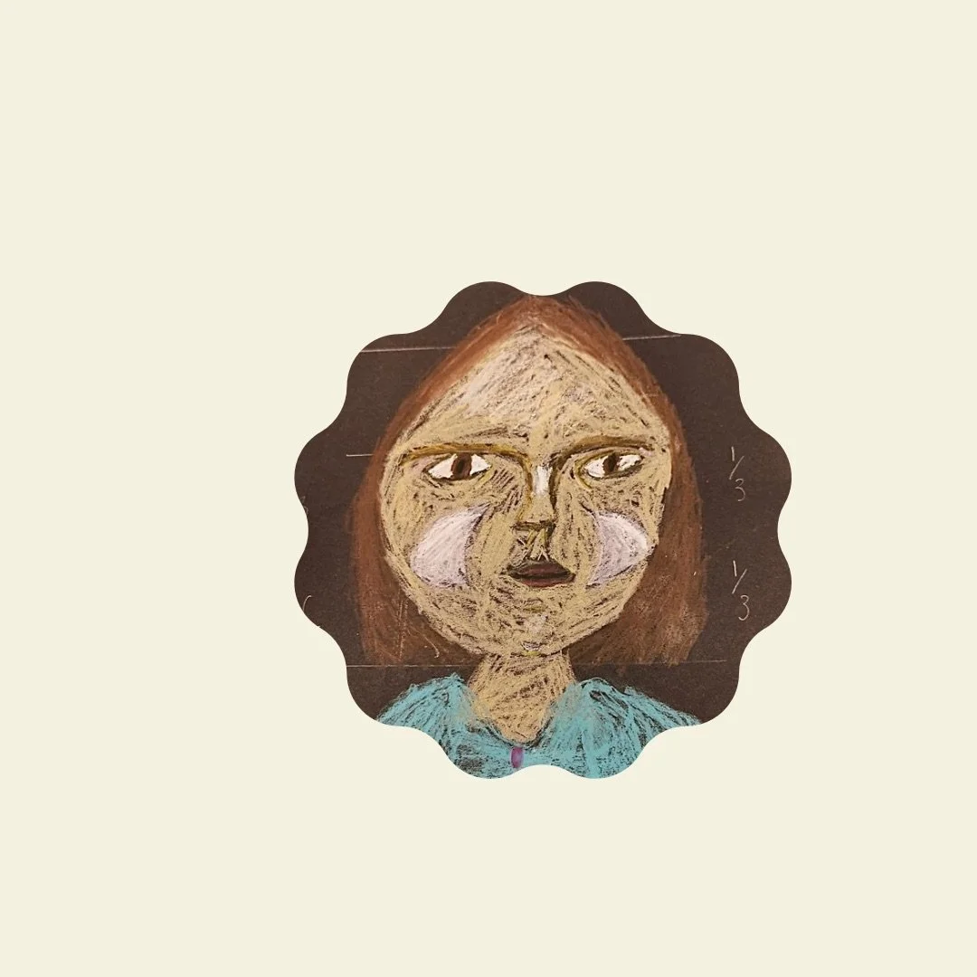 Drawing of a woman's face with long hair, wearing a blue top, on a dark scalloped-edged background.