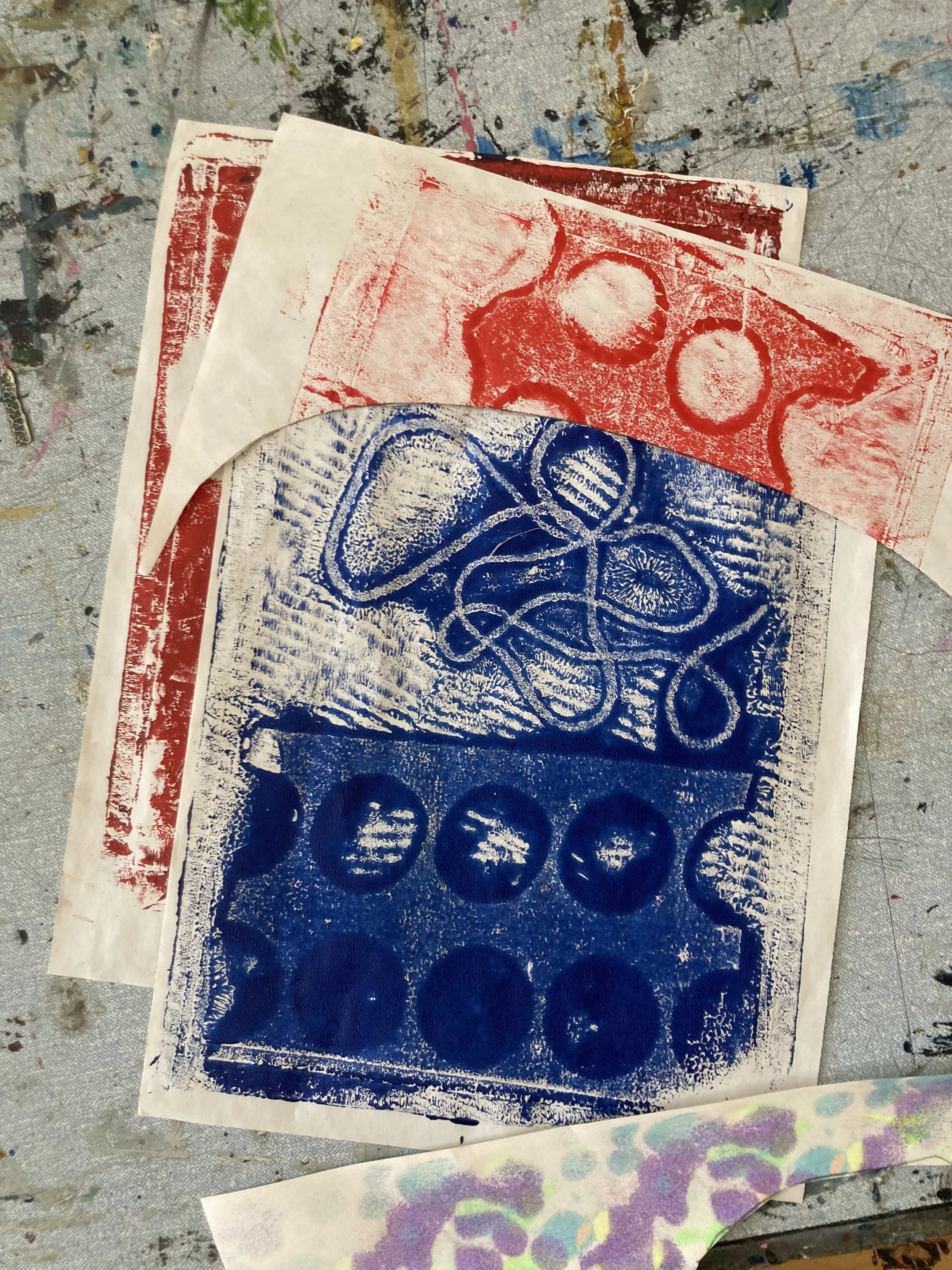 Two pieces of art print or stamping paper, one in red and one in blue, with abstract designs and patterns, on a splattered work surface.