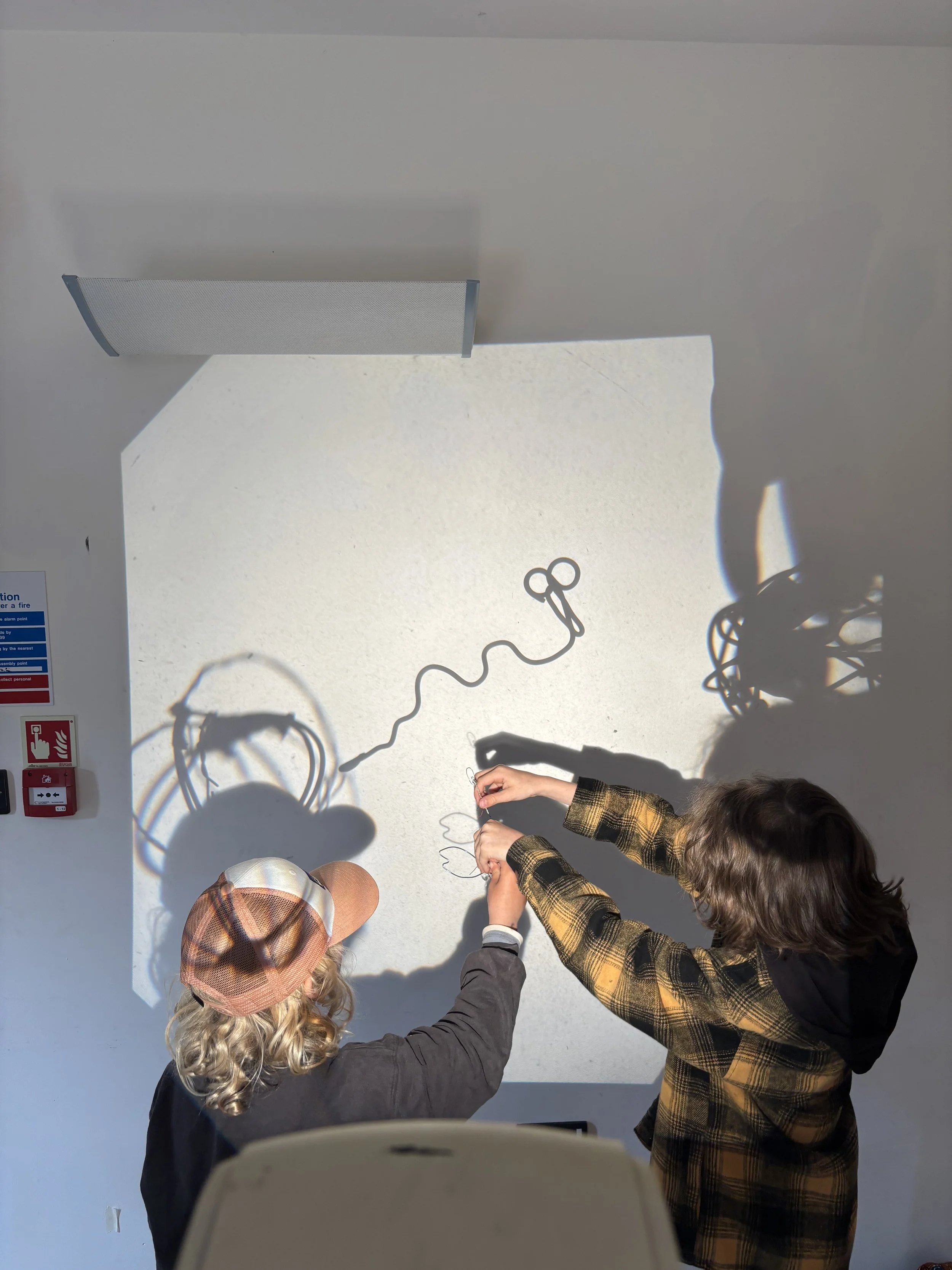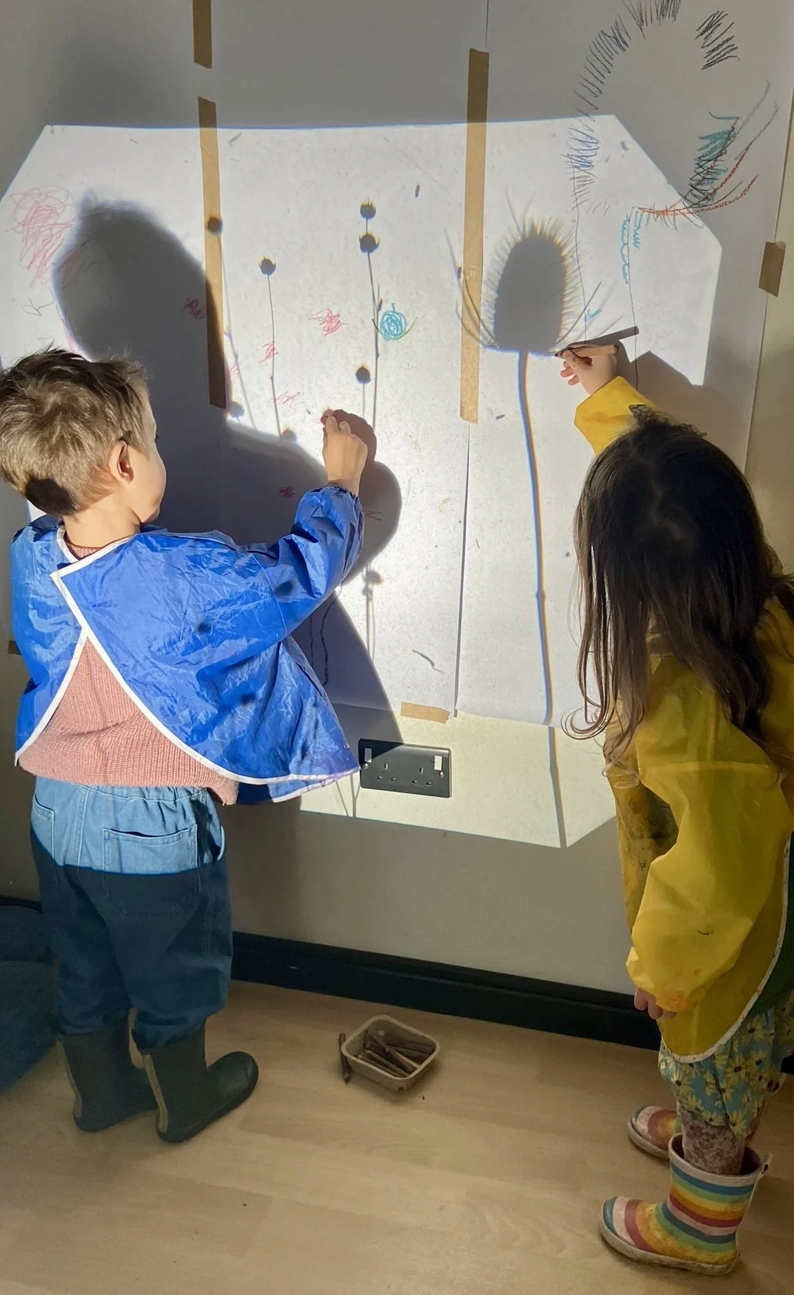 Two children stand on chairs, drawing on a white wall with shadows cast by their hands and drawing tools.