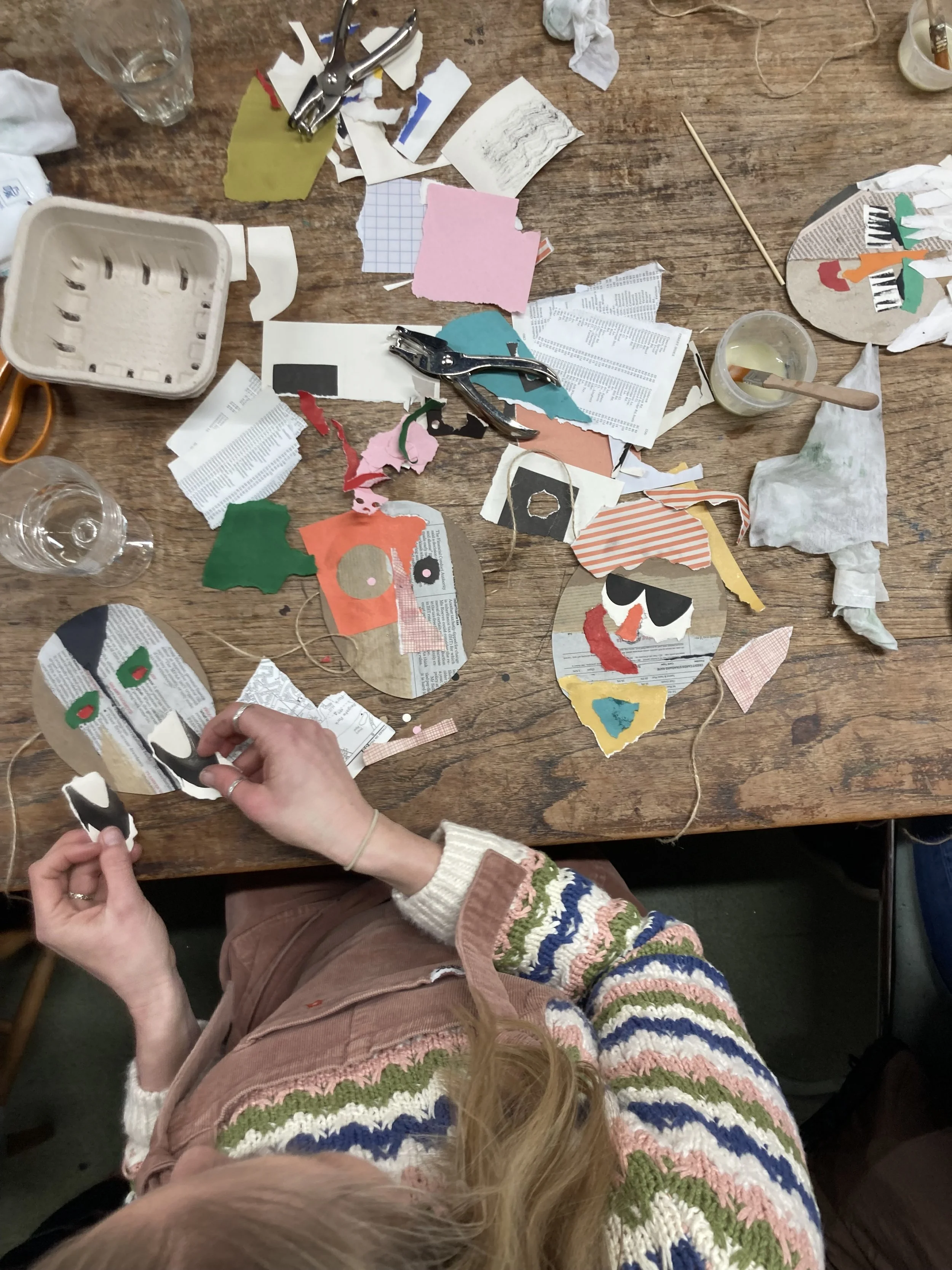 Woman creating paper masks with colorful paper and collage materials on a wooden table cluttered with craft supplies.