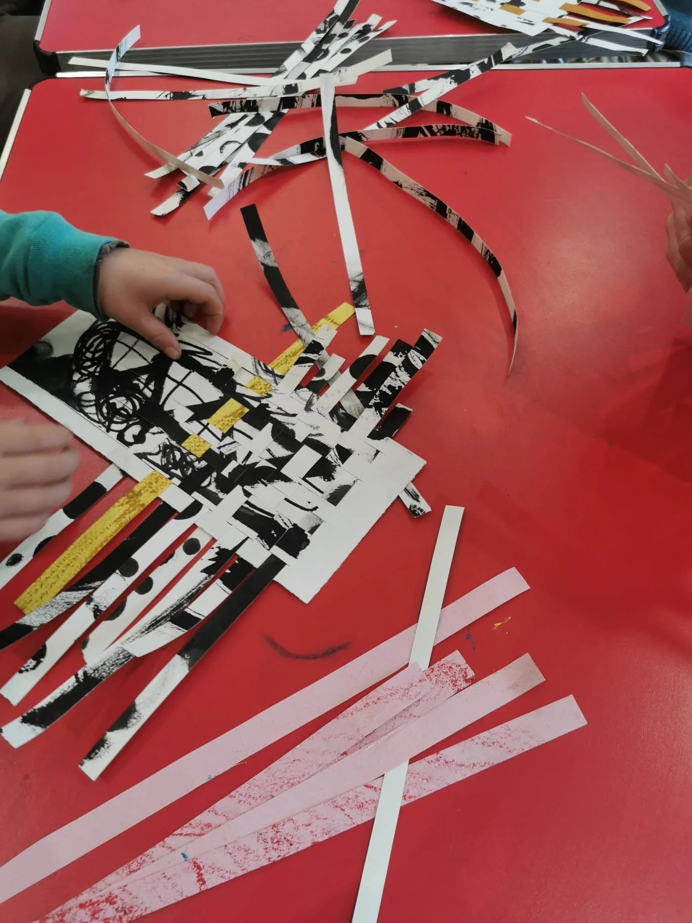 Children creating a collage using black, white, pink, and yellow strips of paper on a red table.
