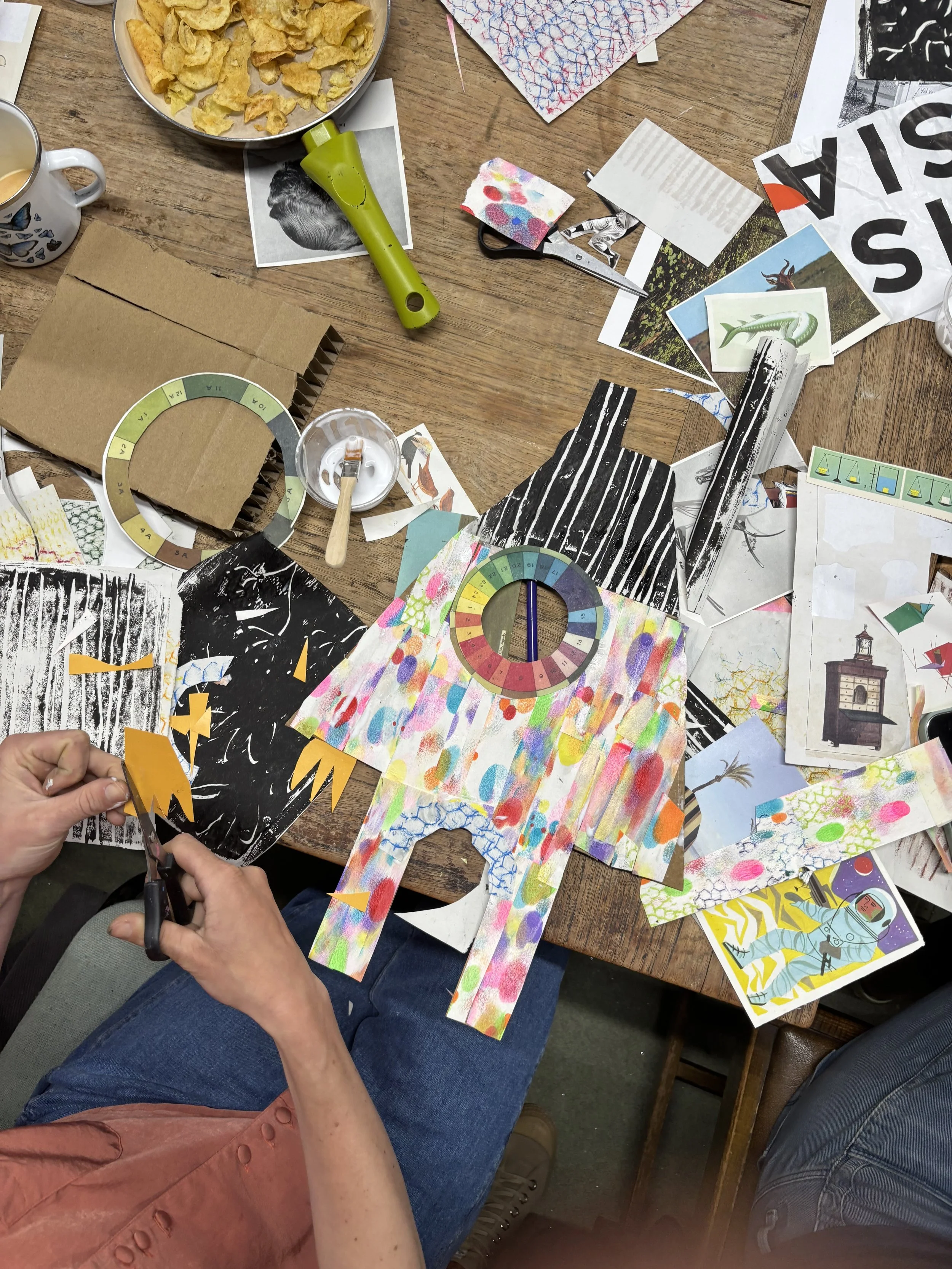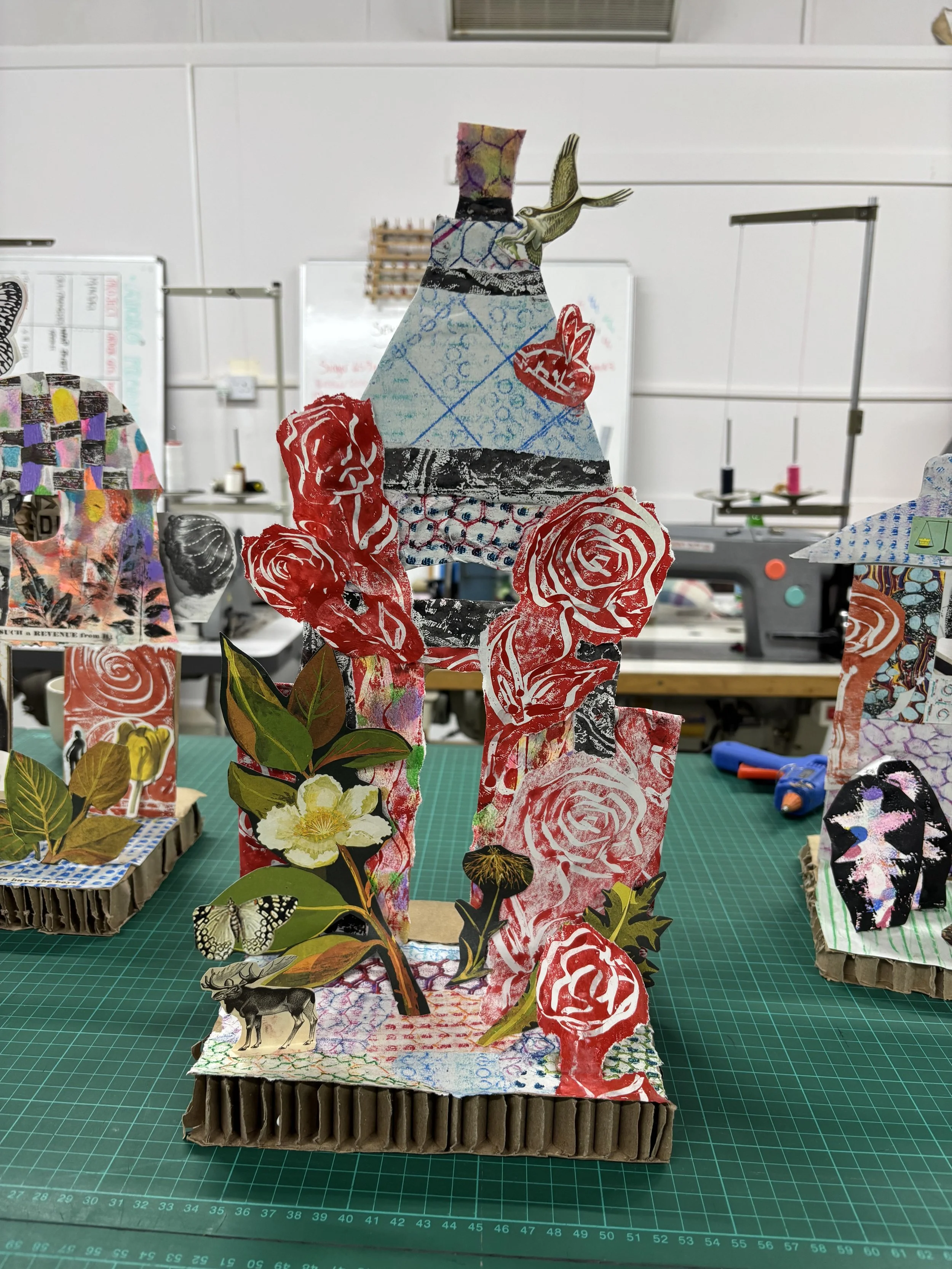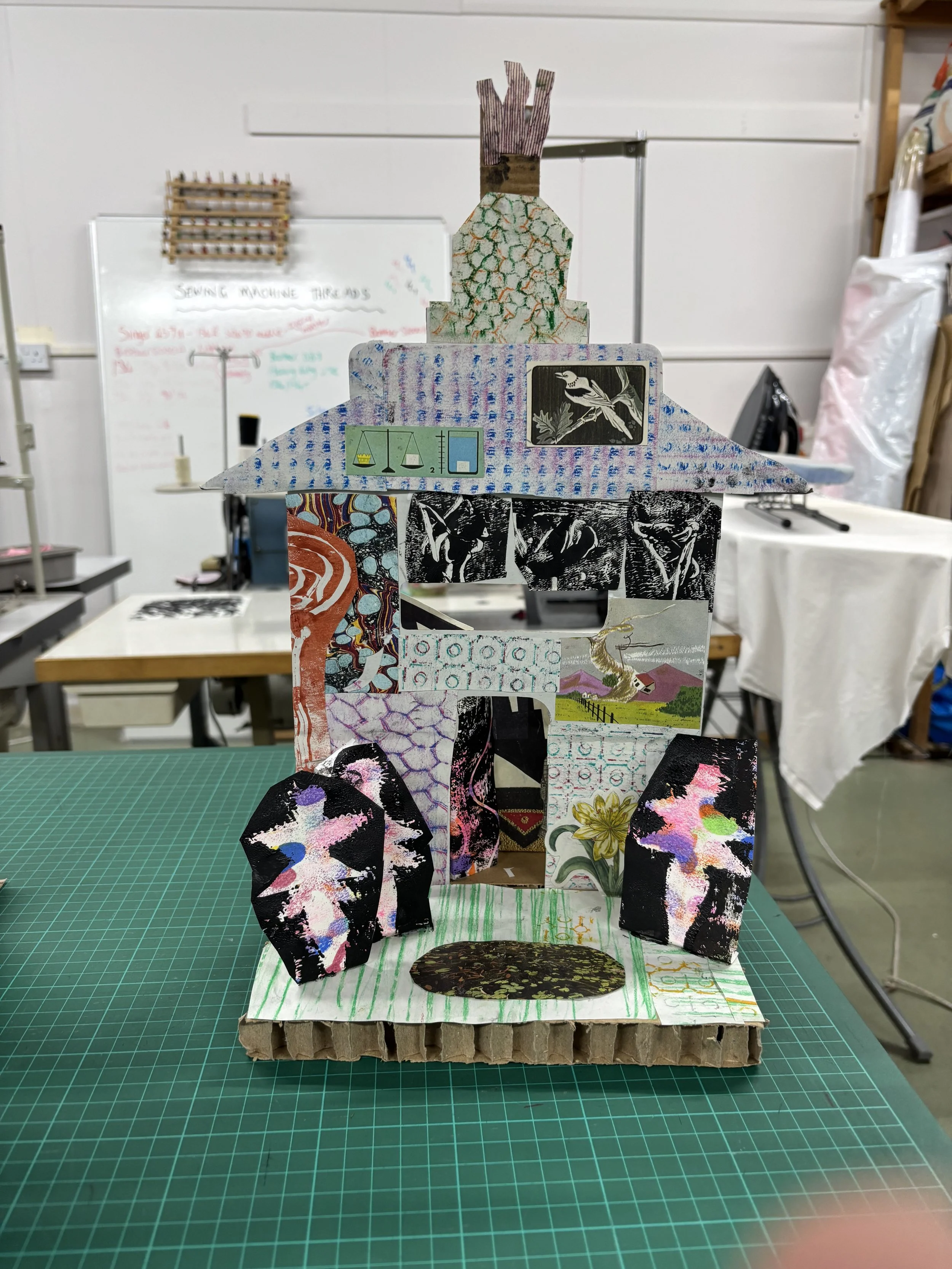 A handcrafted collage art piece resembling a house, made from painted cardboard and paper, with various patterns and images, placed on a green cutting mat in a workshop.
