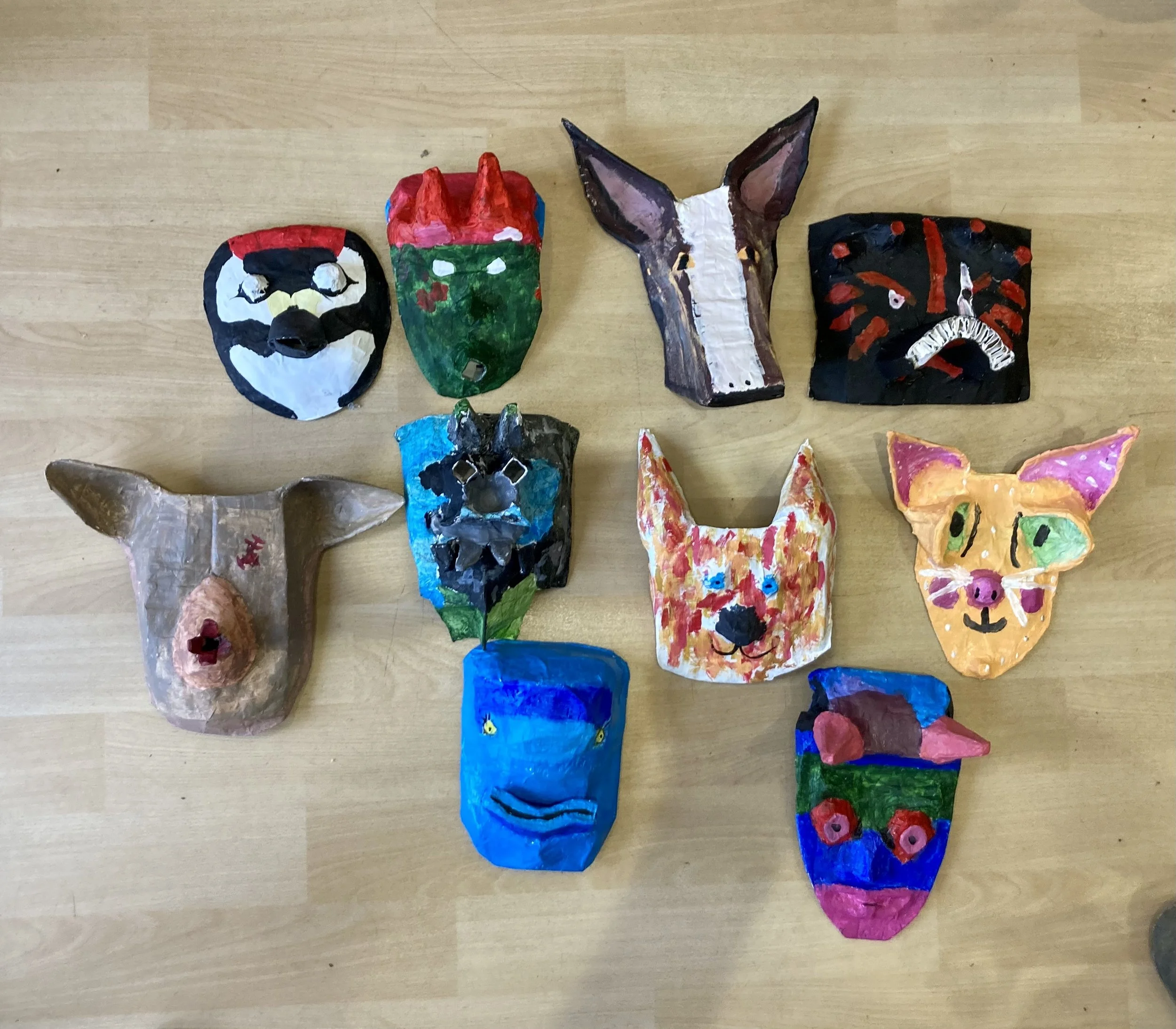 Collection of colorful, hand-painted paper mache masks resembling animals and abstract faces on a light wooden surface.