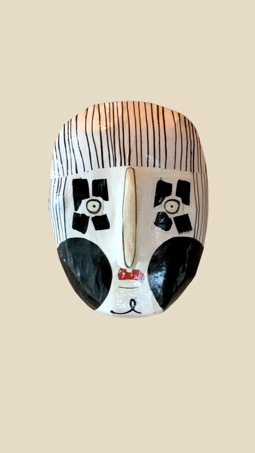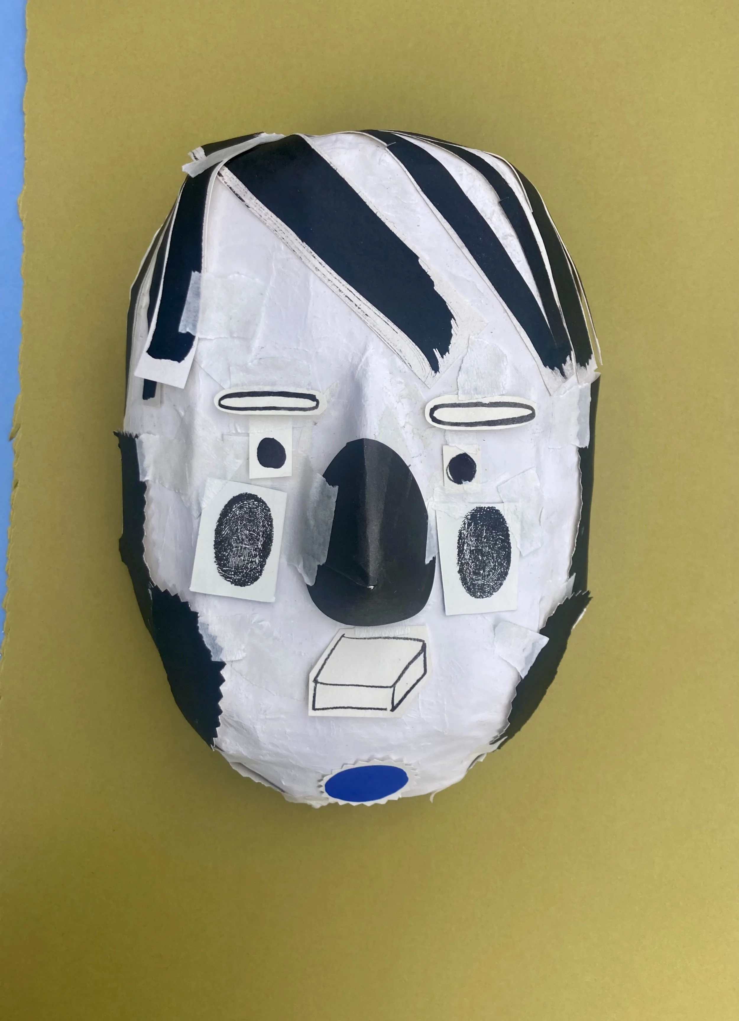 A handmade mask with a cartoonish face, black and white features, wide-open eyes, a large nose, and a surprised expression, set against a blue background.