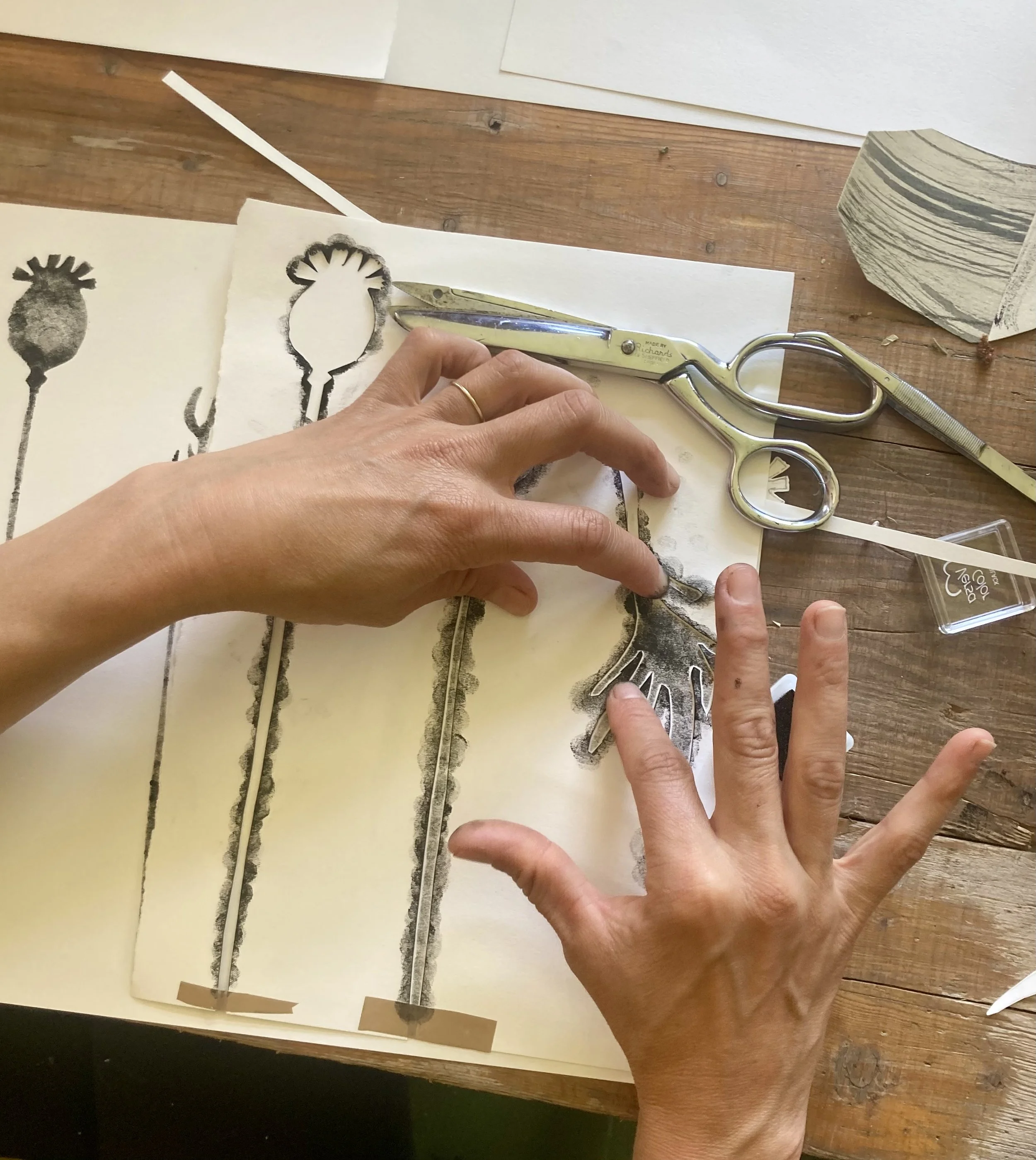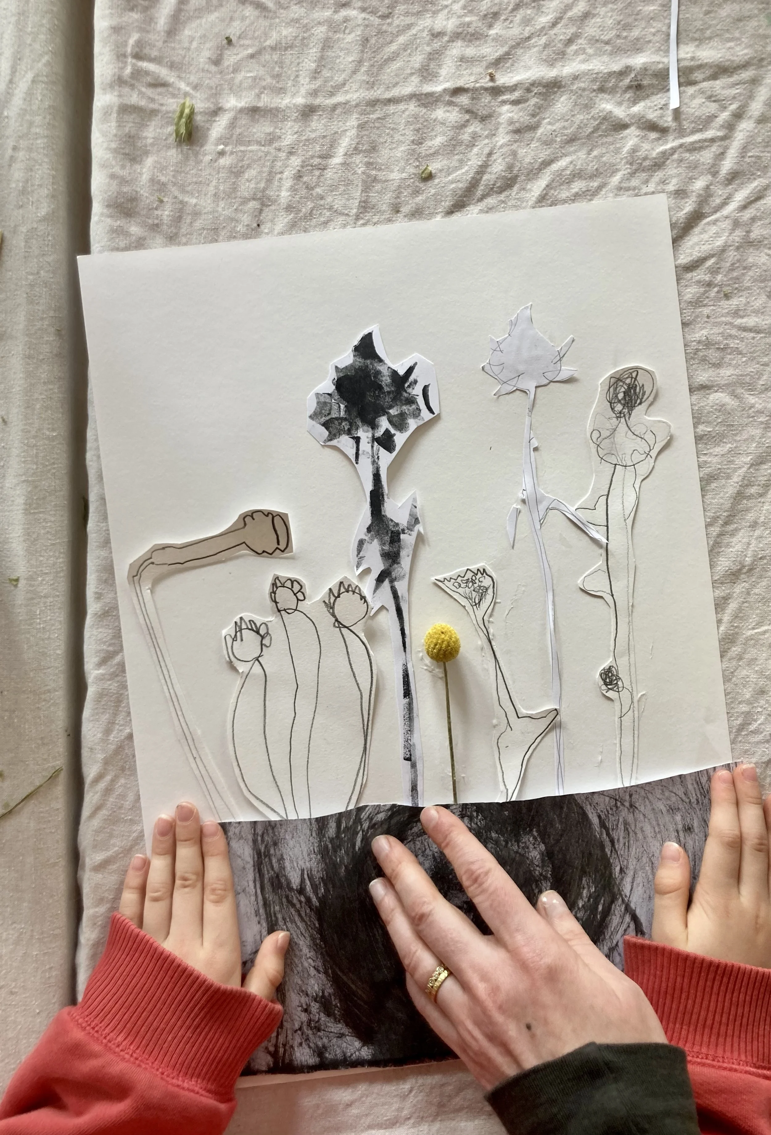 A collage of botanical illustrations with cut-out and drawn flowers on white paper, in a combination of black and white sketches and colored accents, with a yellow pin attached, placed on a fabric surface.