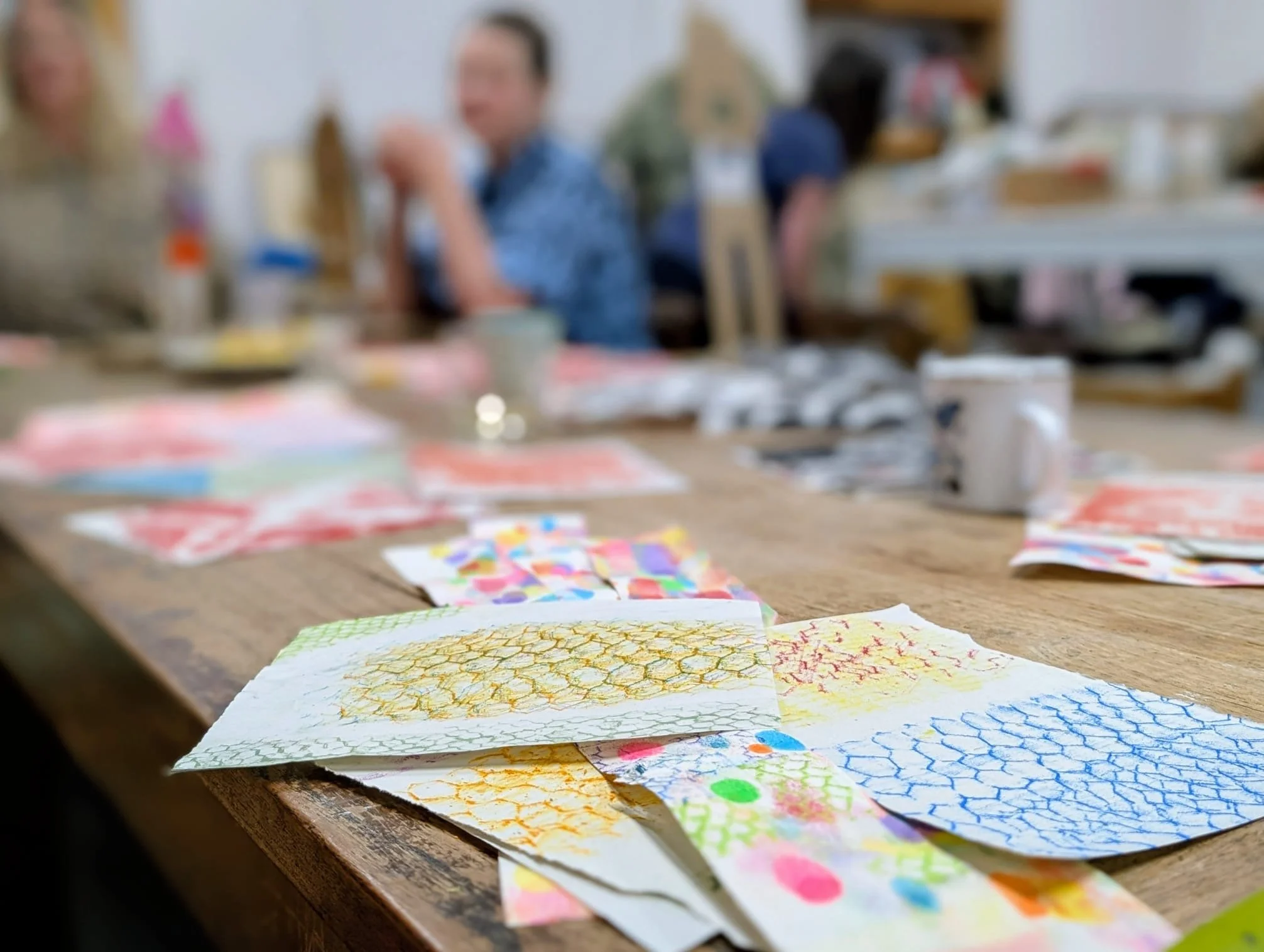 Colorful pieces of paper with various patterns spread out on a wooden table, with blurry people in the background.