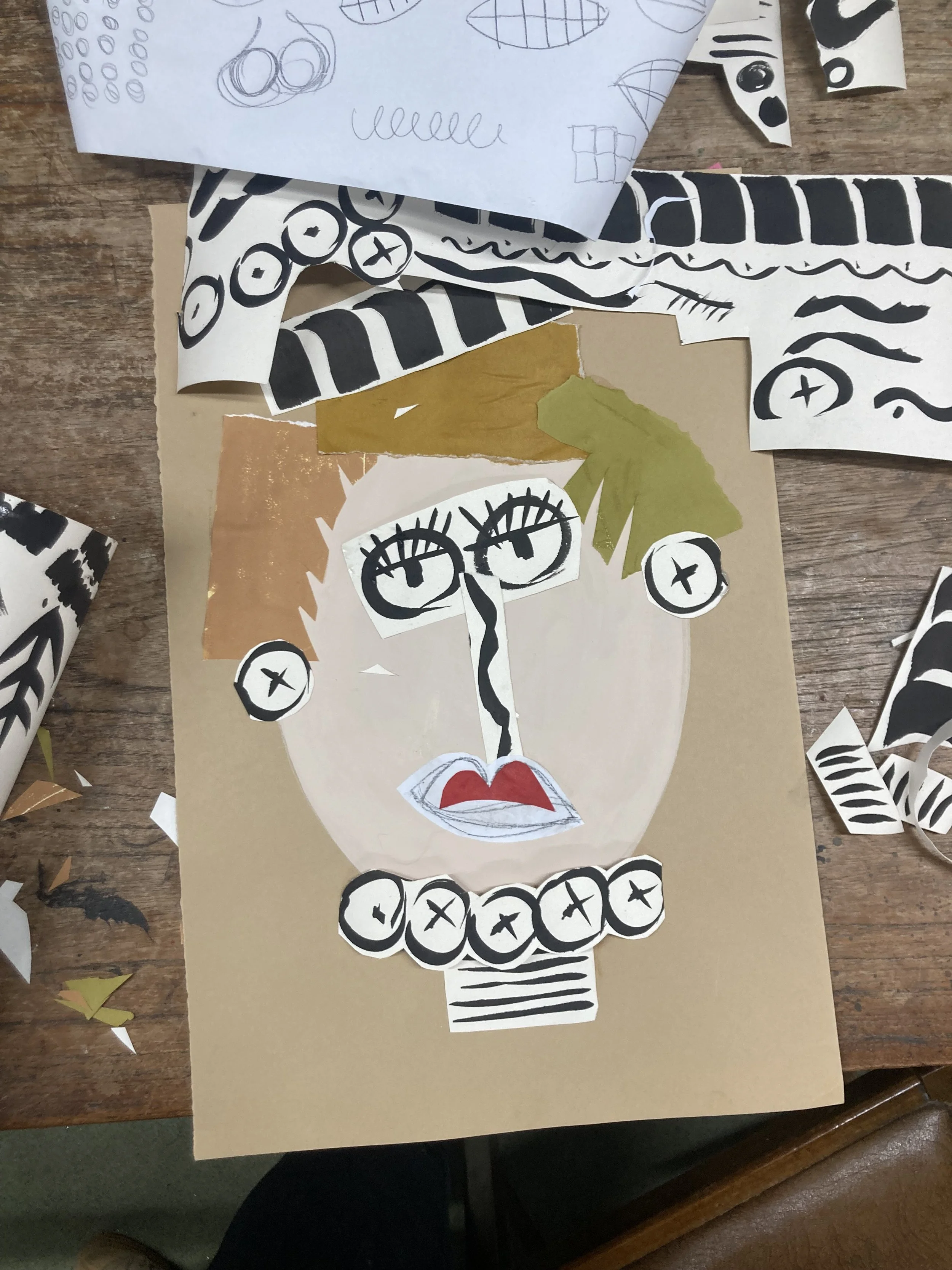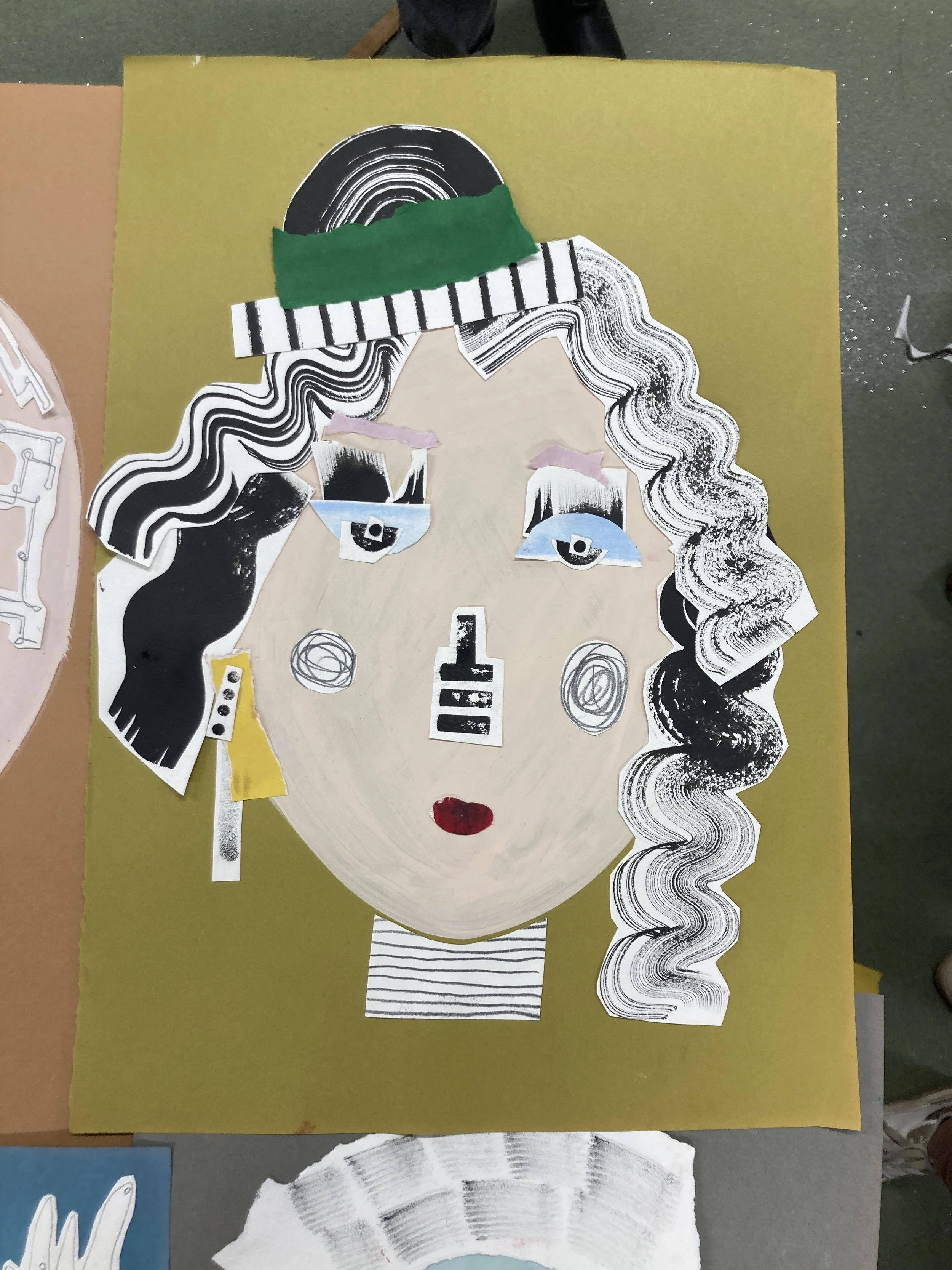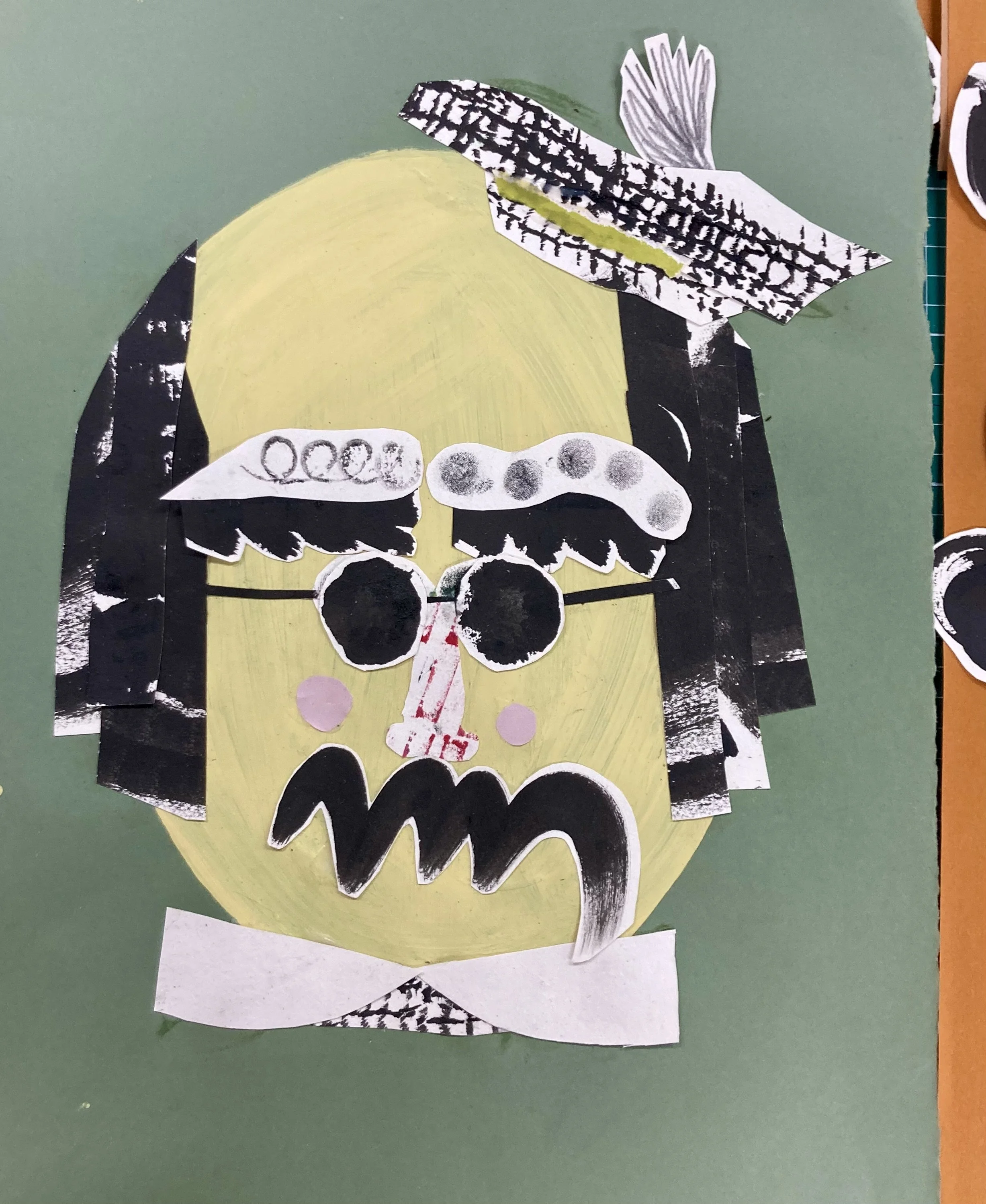 Collage of torn paper arranged to resemble a face with spiky yellow hair, big eyes, a green nose, and a striped green and white mouth, on a white textured background.