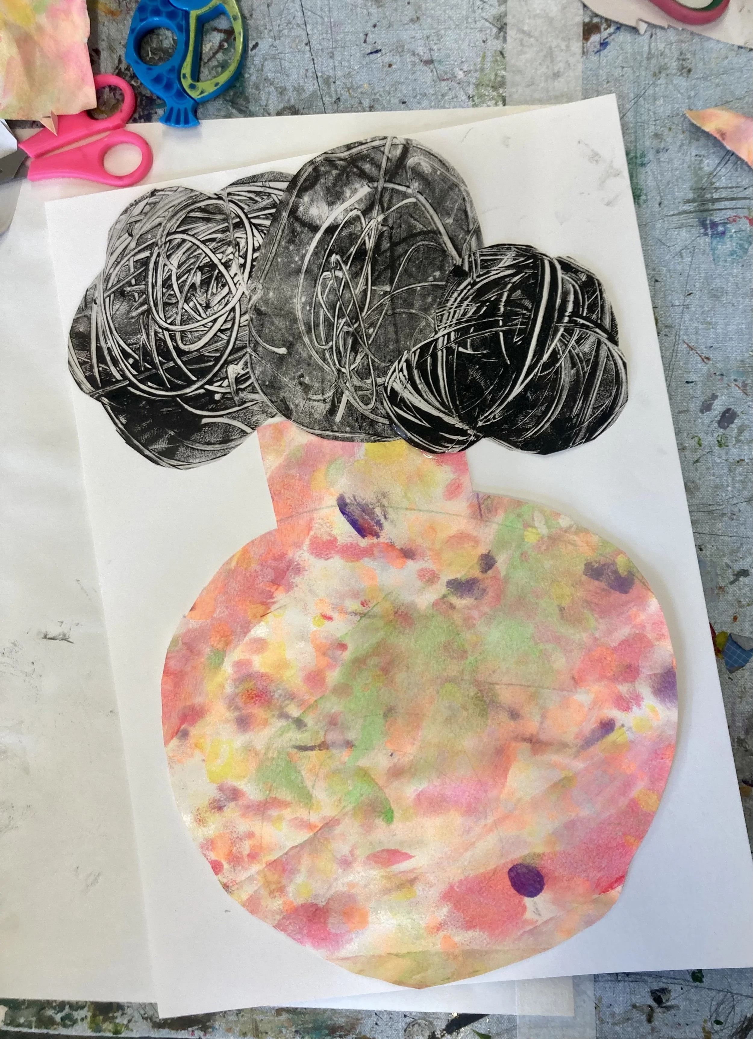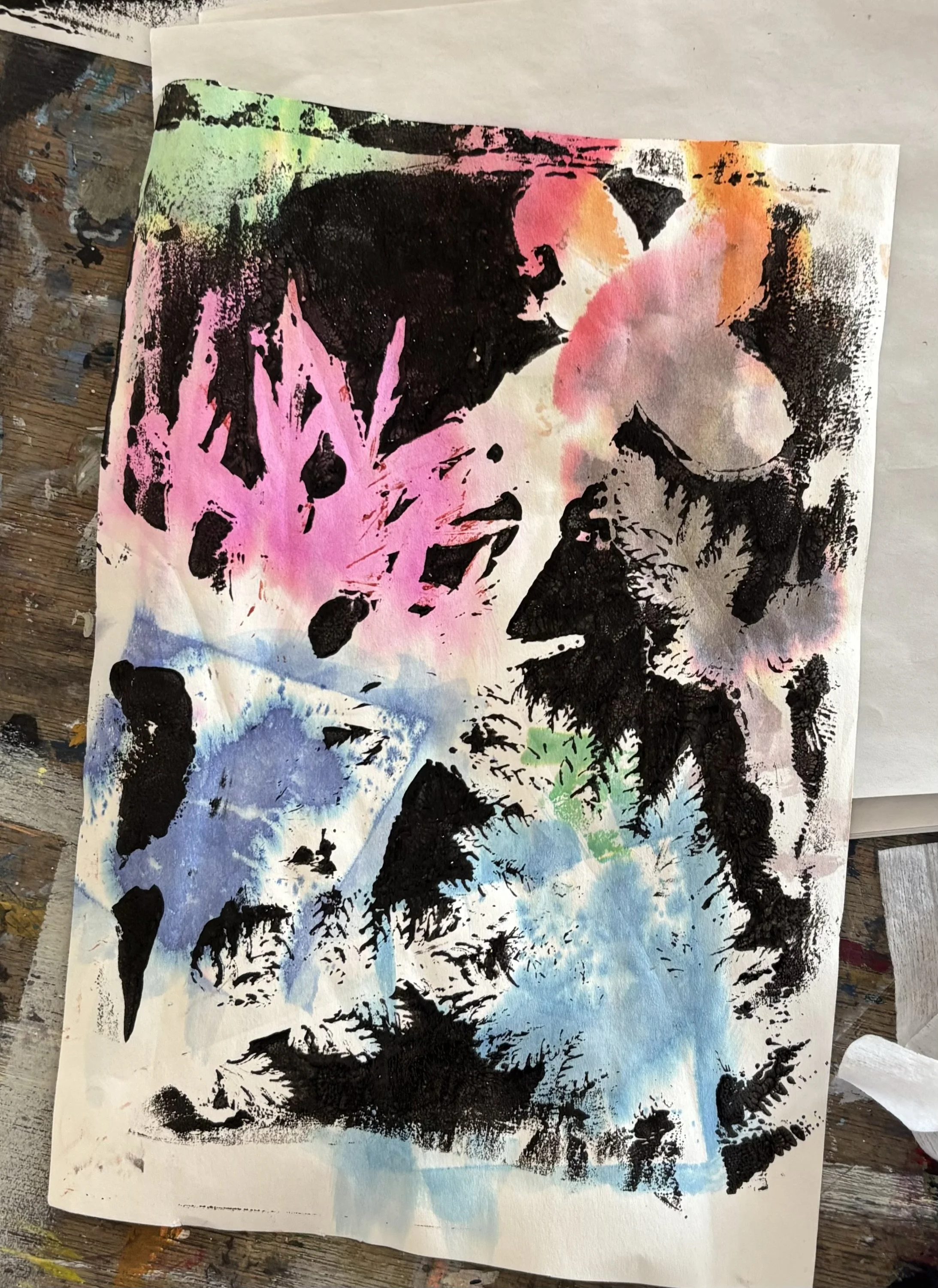 A piece of paper with an abstract, multicolored, watercolor-like circular shape at the bottom and a black-and-white, tangled wire sculpture of a face or mask at the top, placed on a paint-stained work table with scissors nearby.