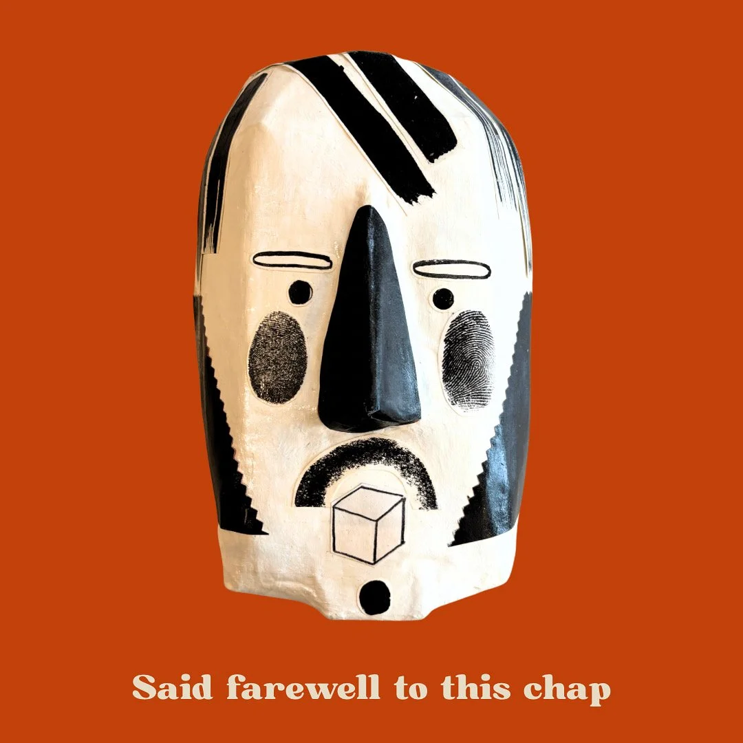 A painted mask with abstract facial features and geometric shapes, set against an orange background, with the text 'Said farewell to this chap' underneath.