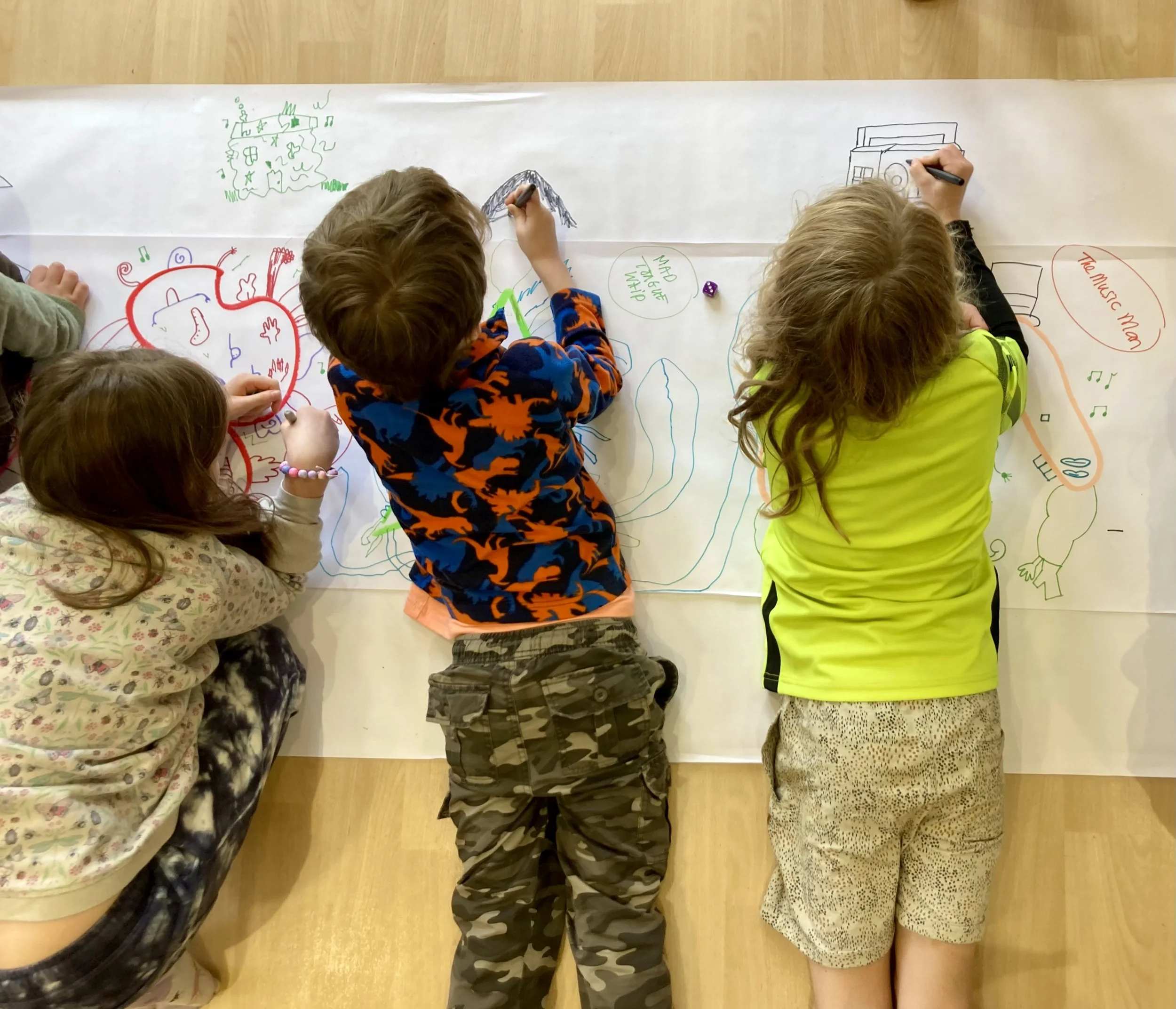 Three children are drawing on a large sheet of paper on the floor, with their backs facing the camera. They are using colorful markers to create illustrations and writings. The children are wearing casual, colorful clothing, and the floor is wooden.