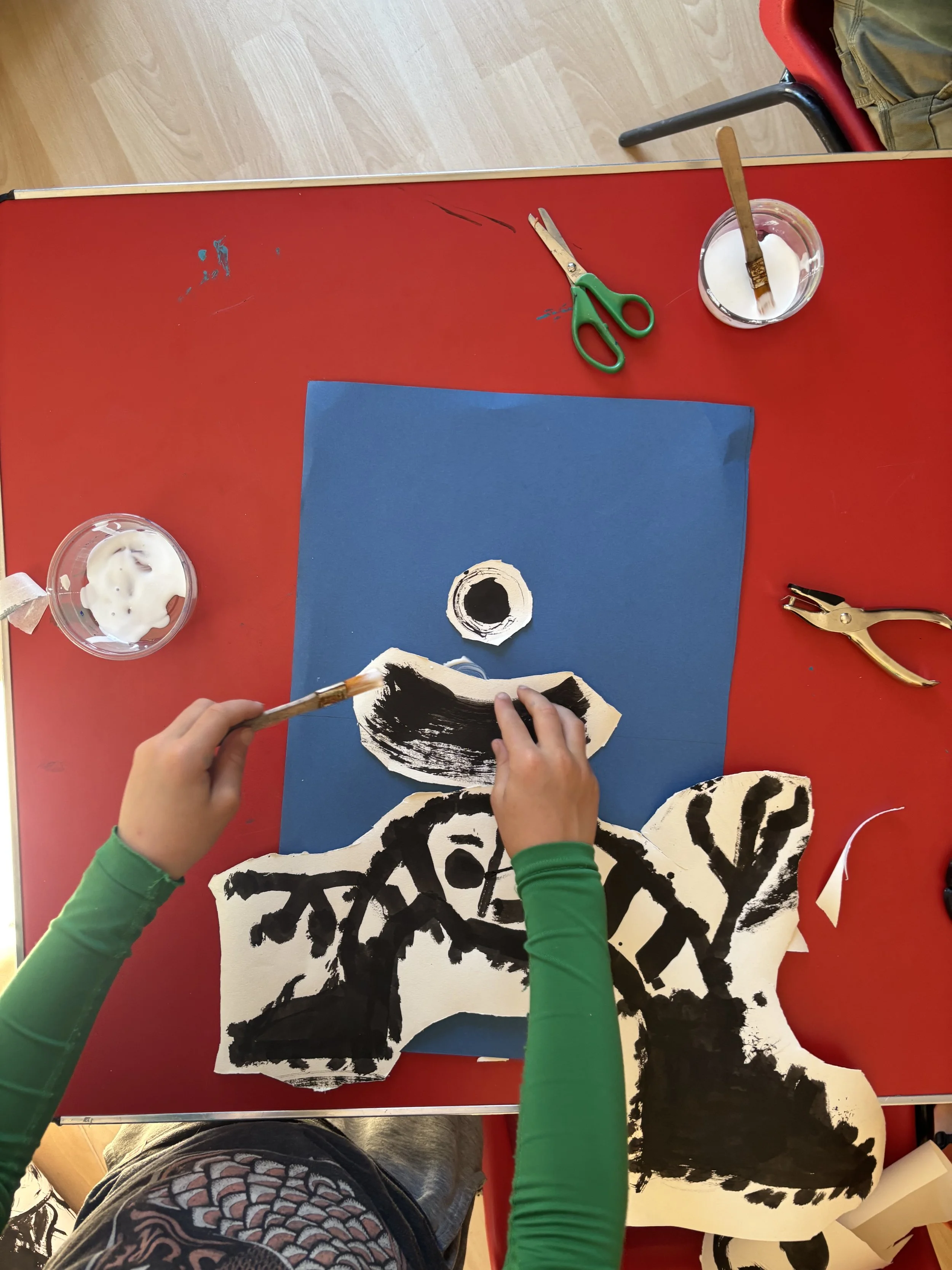 A child painting black ink on a torn piece of paper to create a tiger's face, with paper and painting supplies on a red table.