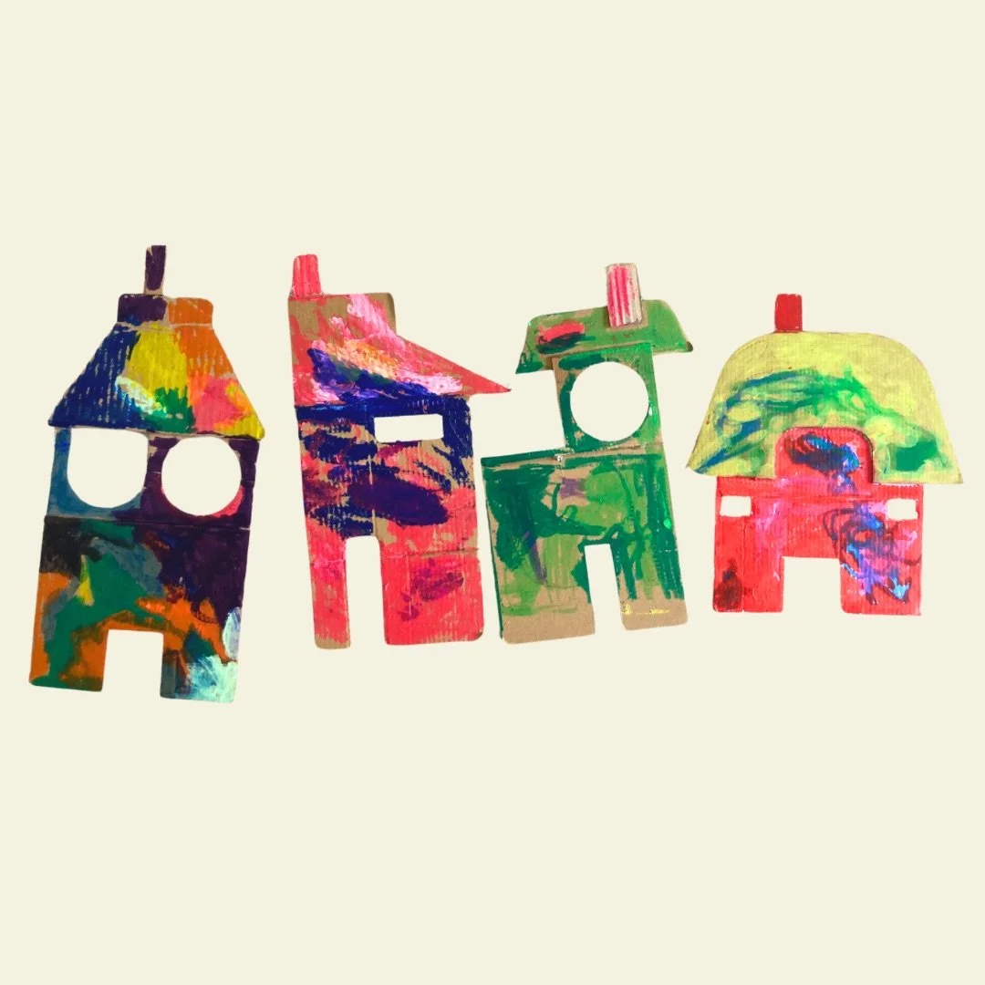Four colorful, abstract house-shaped cutouts with circular and rectangular cutouts, painted with vibrant, mixed brush strokes, arranged in a row.