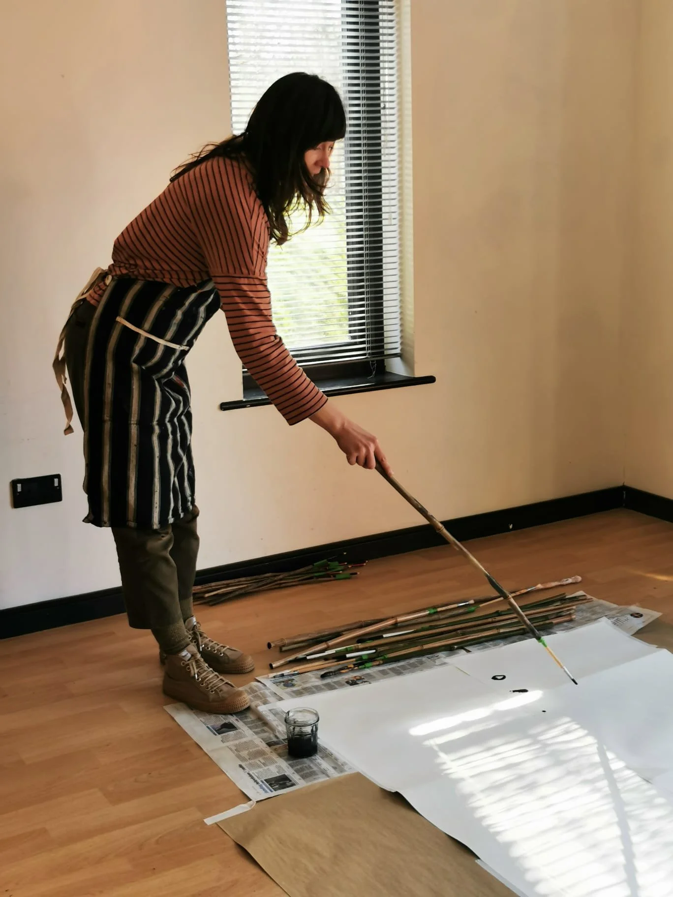 Woman painting on a large white paper sheet spread on the wooden floor with brushes and newspaper underneath, near a window with blinds.