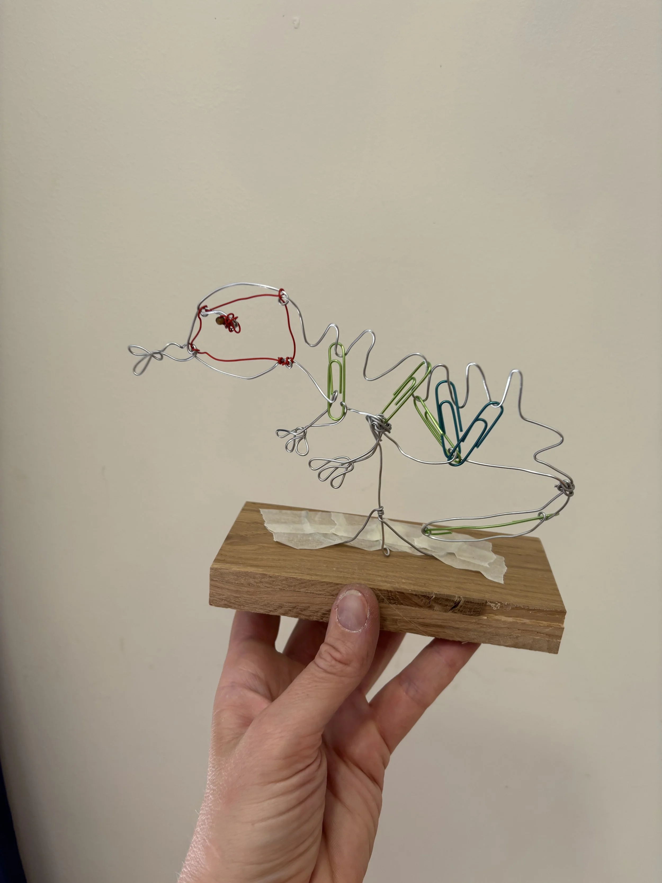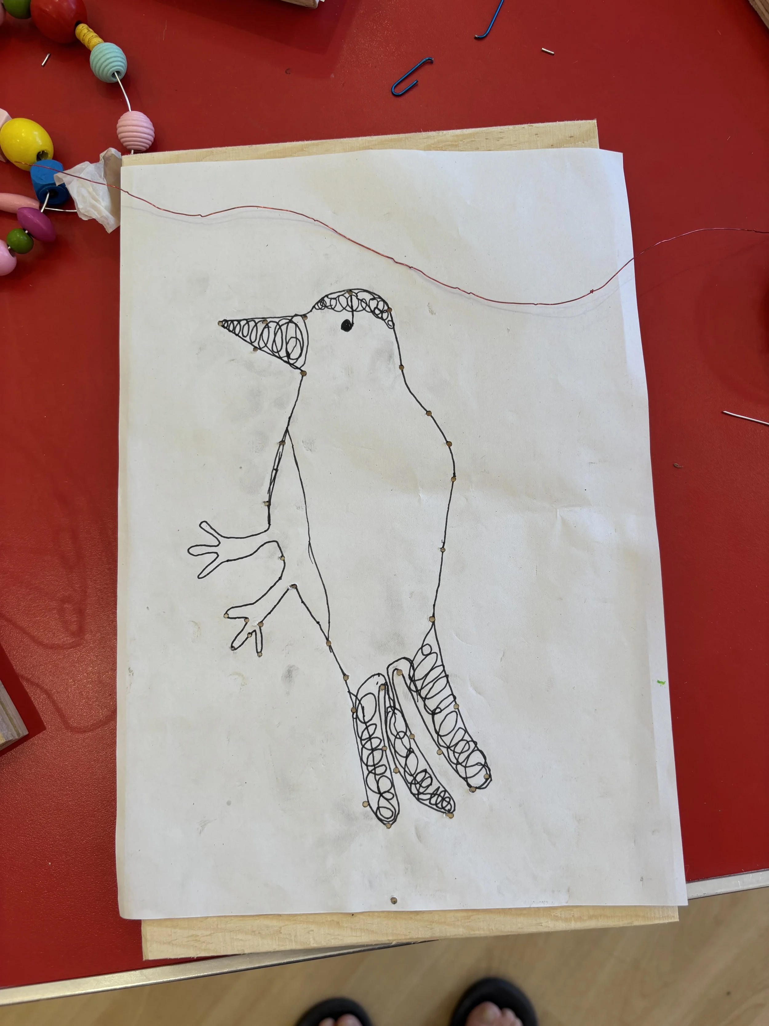 A drawing of a bird, outlined with a wire possibly, on a white sheet of paper, with some parts filled in with colorful beads and some parts decorated with wire spirals, laid on a red table surrounded by craft supplies.