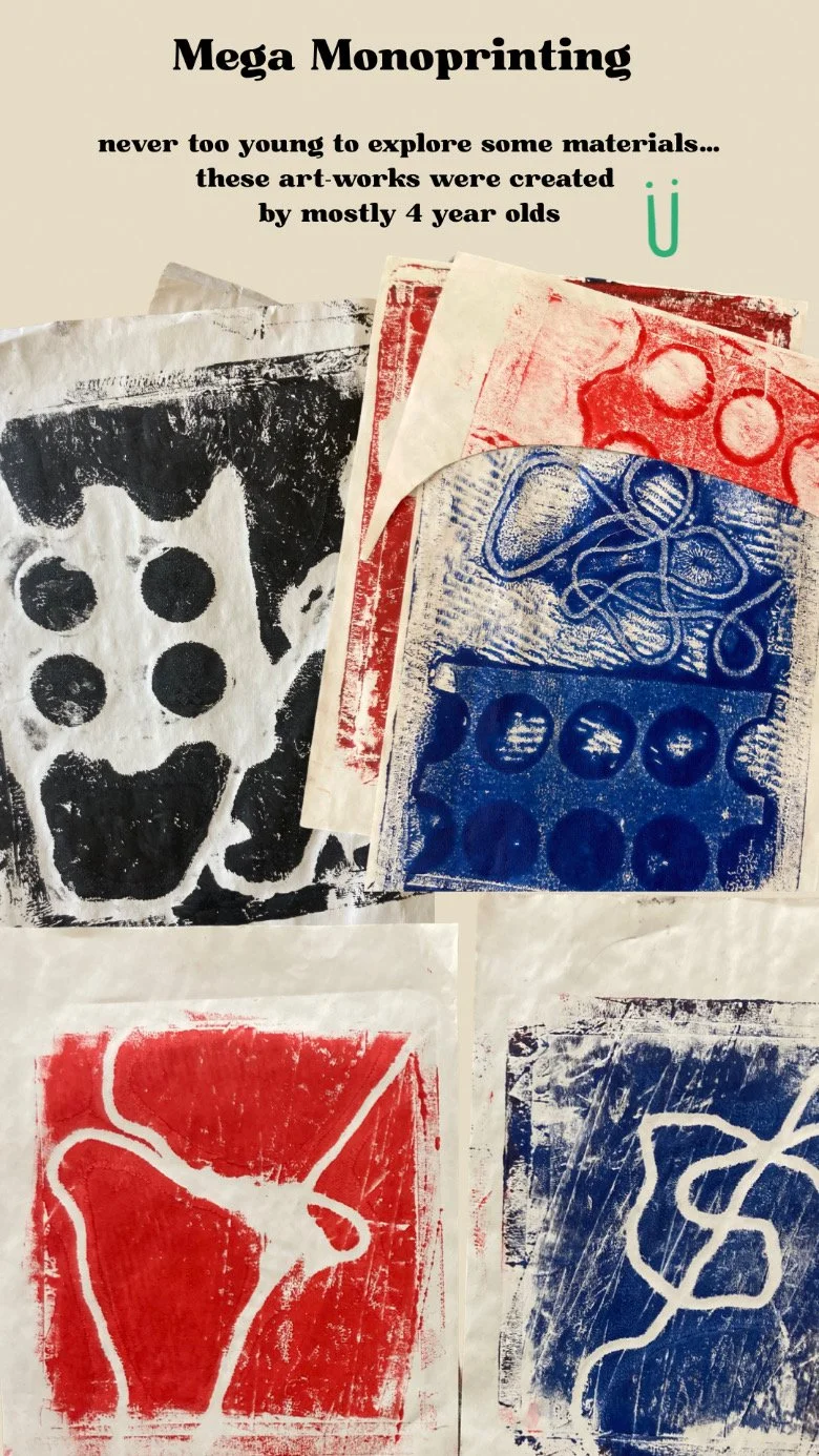 A display of colorful, abstract art prints created by young children, featuring bold shapes and lines in black, red, blue, and white, with a heading that reads 'Mega Monoprinting' and text explaining that the artworks were made by mostly four-year-ol