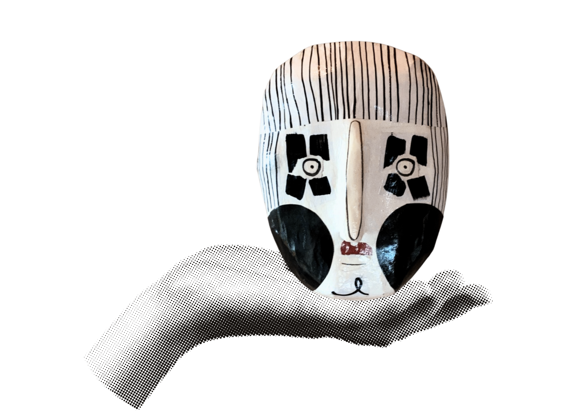 A paper mache mask resembling a face with black and white features, black hair with streaks, and small drawings of a box and fingerprint details, mounted on a yellow wall.