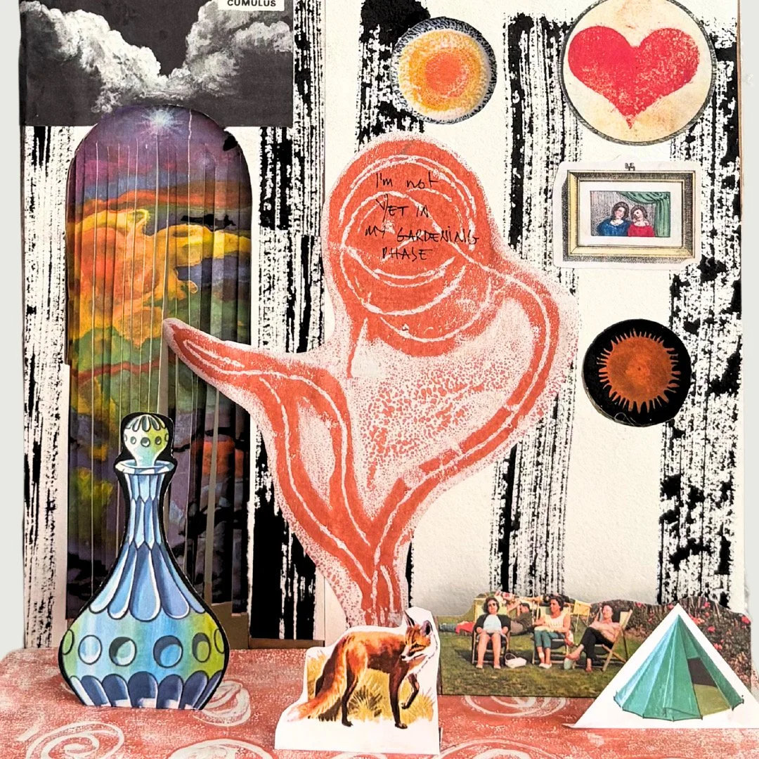 Eclectic collage wall with various images, paintings, and decorations including a large red abstract face, a yellow sun, a heart, a framed photo of two women, and a starry sky scene. There is also a toy fox figure, a painted bottle, a paper photograp
