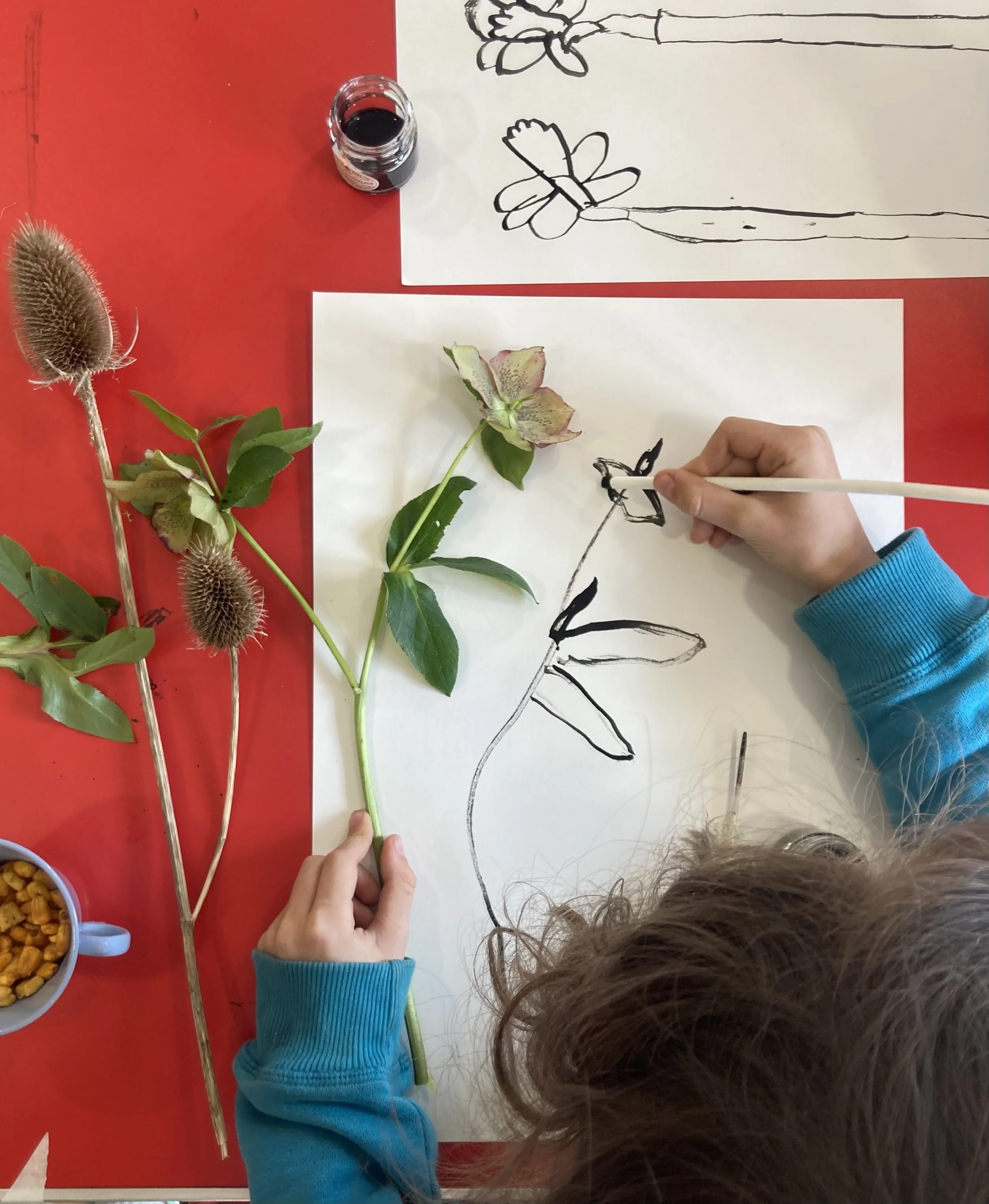 Child creating a botanical art project with real plant parts and ink, drawing an outline of a flower on white paper, with plant stems and flowers on a red table.