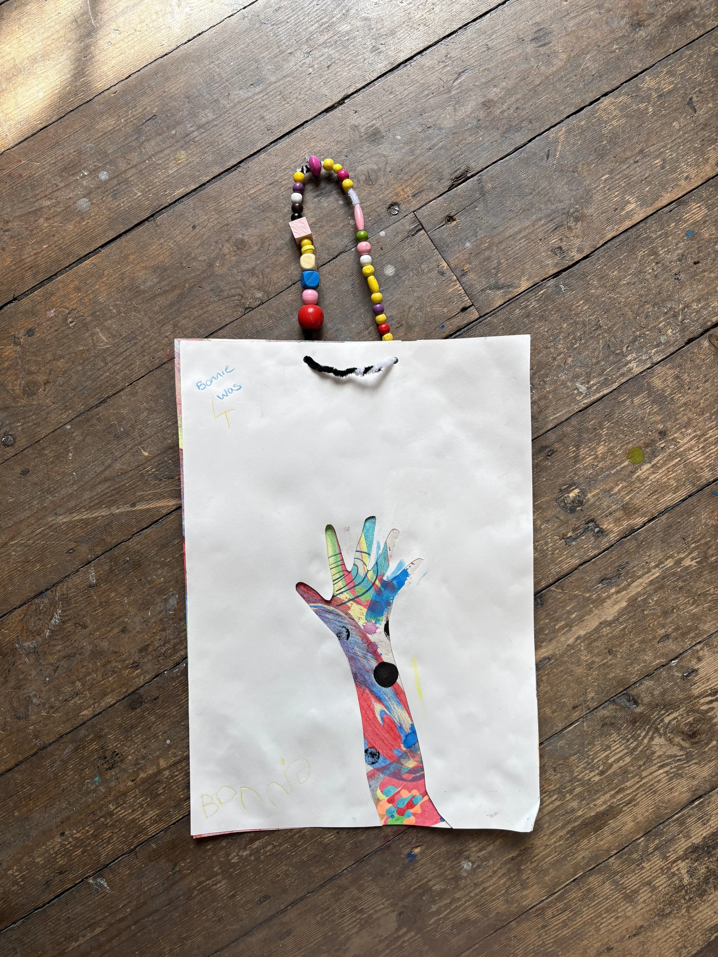 Colorful paper bag with a rainbow-colored handprint and a beaded handle, placed on a wooden floor. The bag has handwritten notes stating 'Bonnie was 4' and 'Bonnie'.