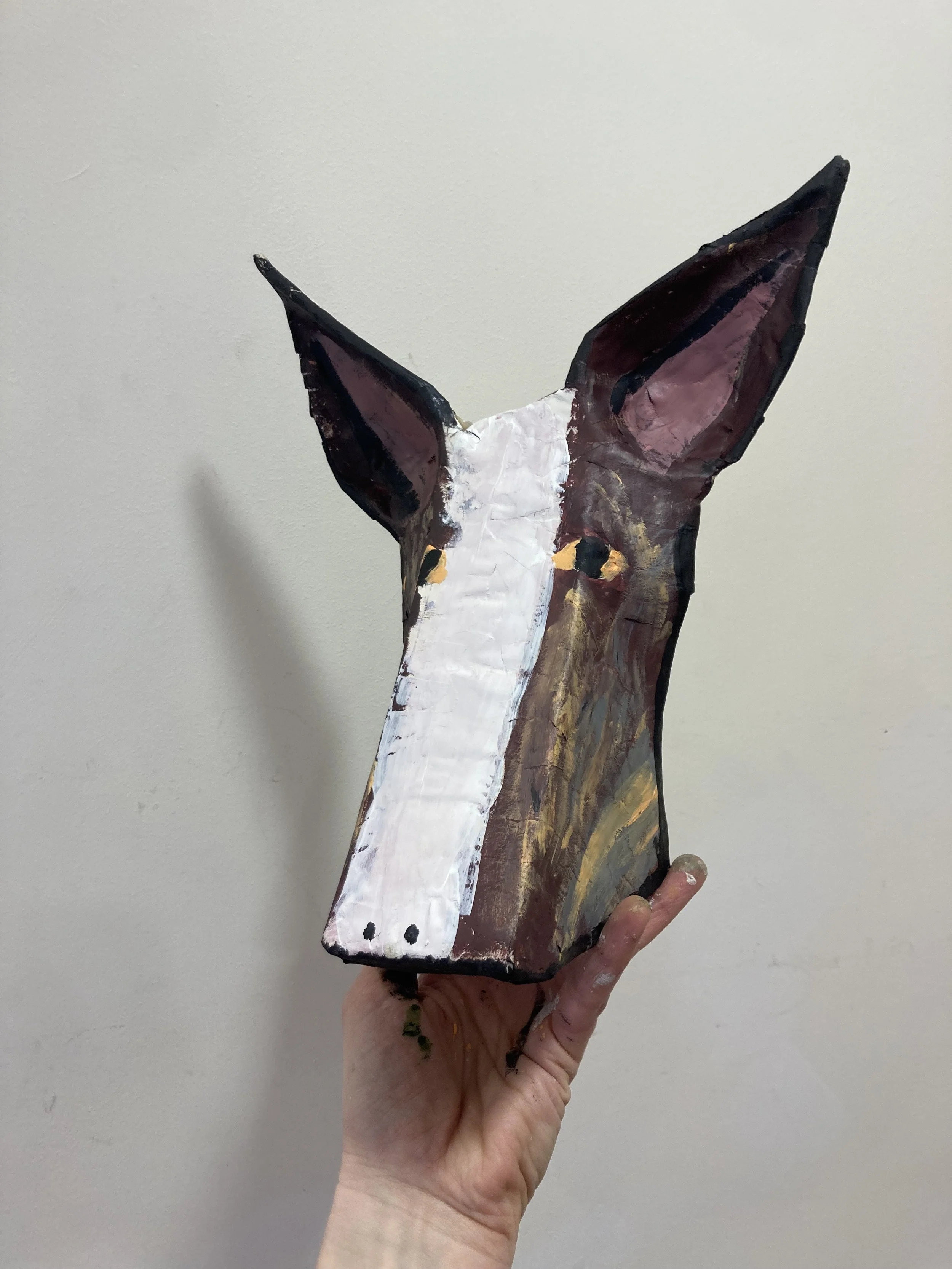 Painted cardboard sculpture of a dog's head with tall ears, featuring a white stripe down the face and brown, black, and white details.