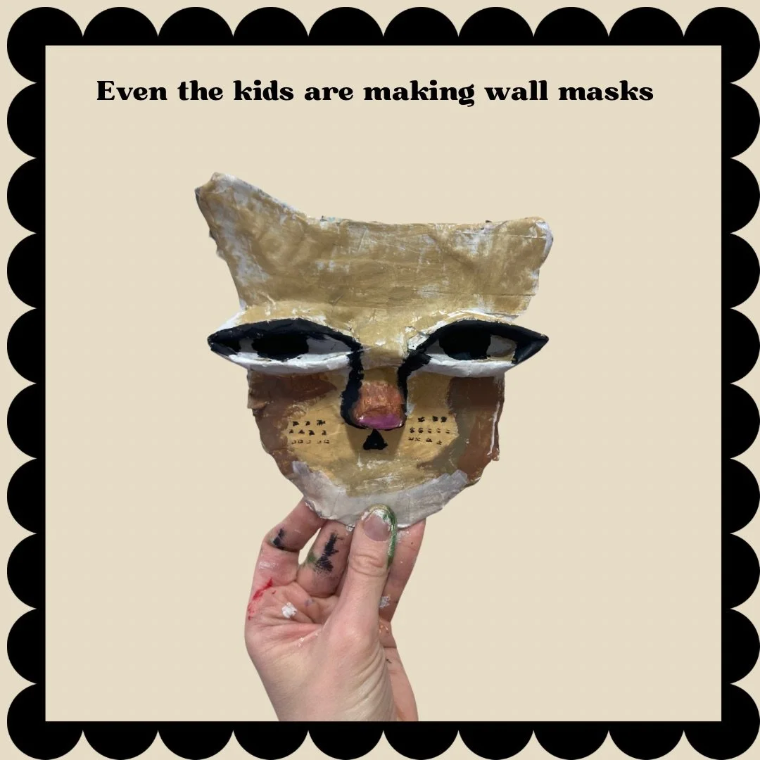 Hand holding a paper mask resembling a cat's face with painted features, with text stating 'Even the kids are making wall masks'.