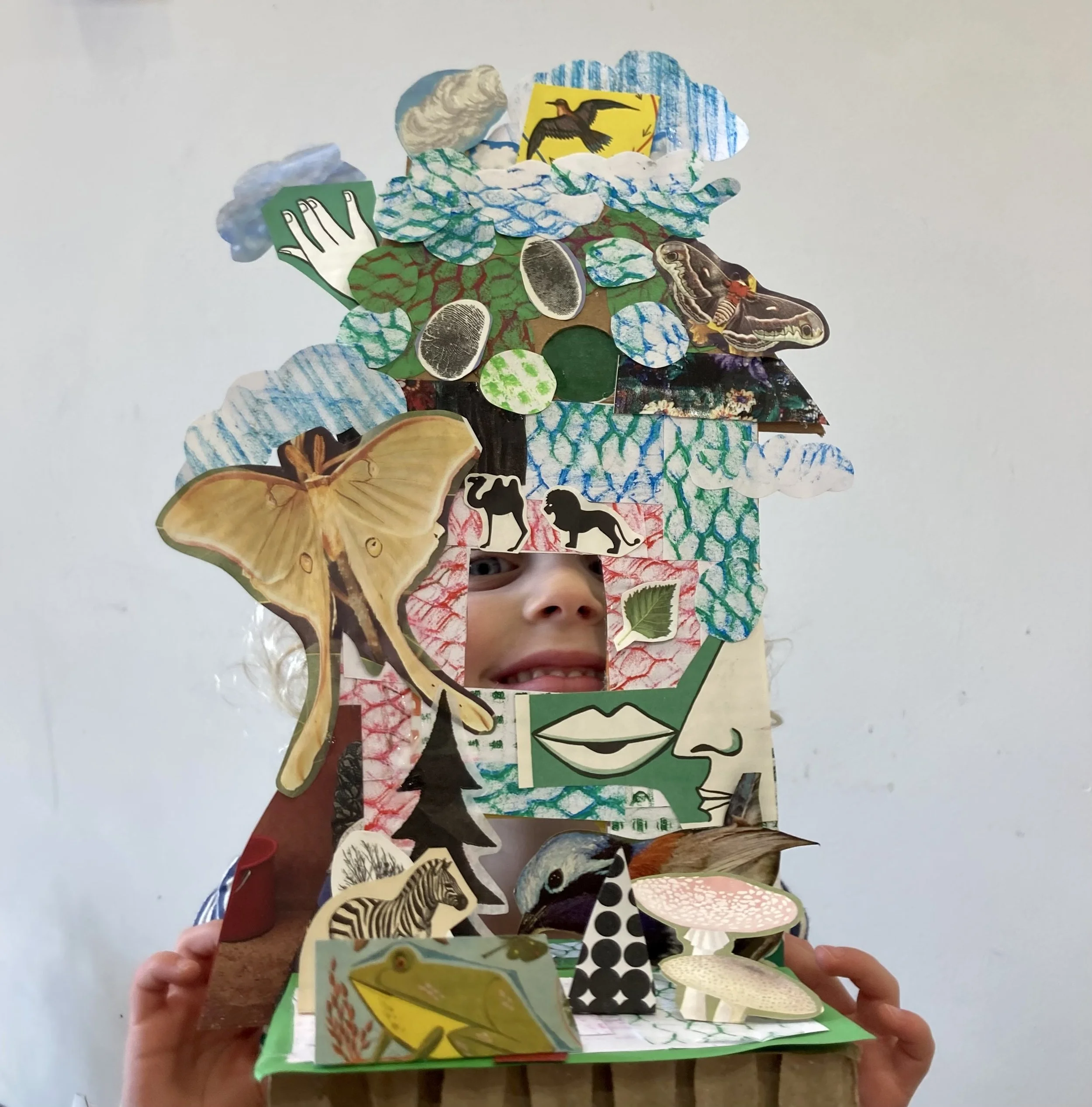 Child's face shows through a hole in a collage made from various paper cutouts of animals, plants, and abstract shapes, resembling a face with a tree and nature elements.