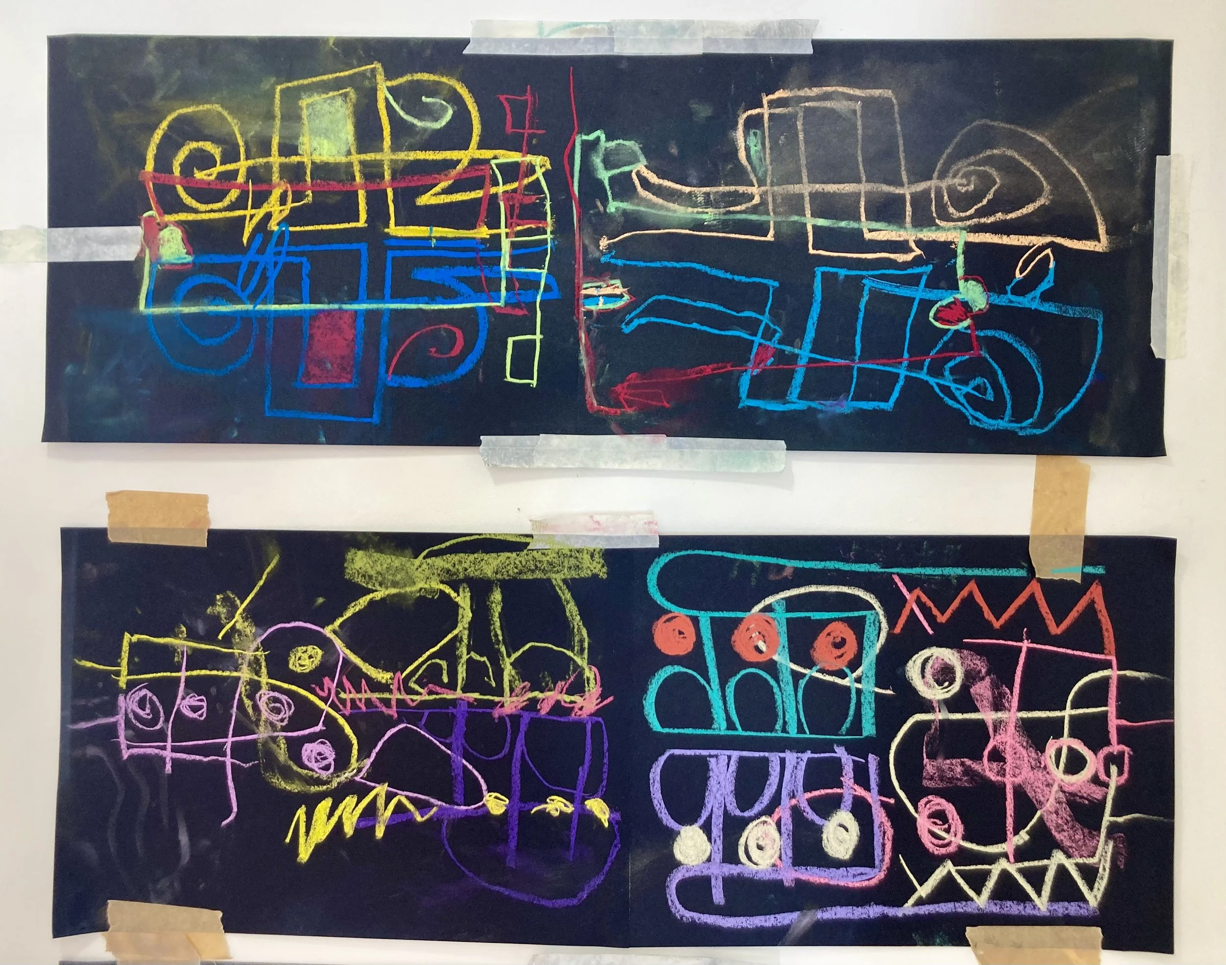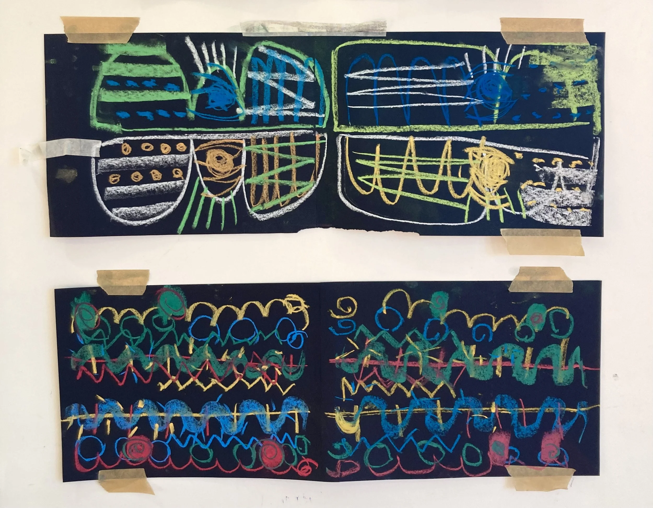 Two black sheets of paper taped to a wall with colorful crayon drawings. The top sheet has abstract, childlike drawings of various shapes and lines in green, blue, yellow, white, and orange. The bottom sheet features rows of colorful, scribbled, stic