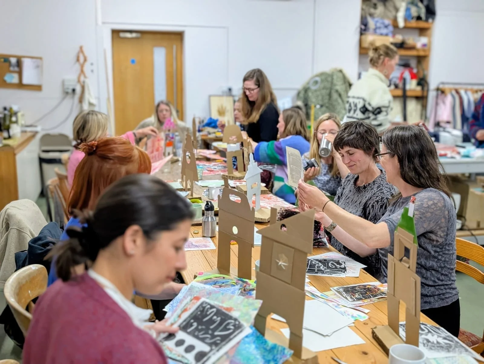 Group of women sitting at a long table making paper crafts with wooden clock and house templates, in a well-lit craft room.