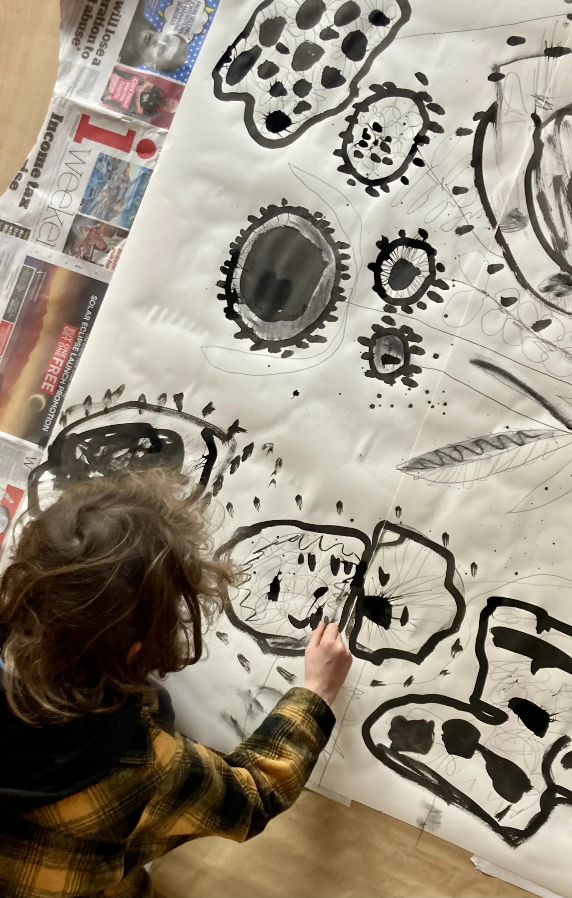 Child with curly hair drawing black ink shapes and patterns on a large sheet of paper that is attached to a wall or table, with newspapers taped around the edges.