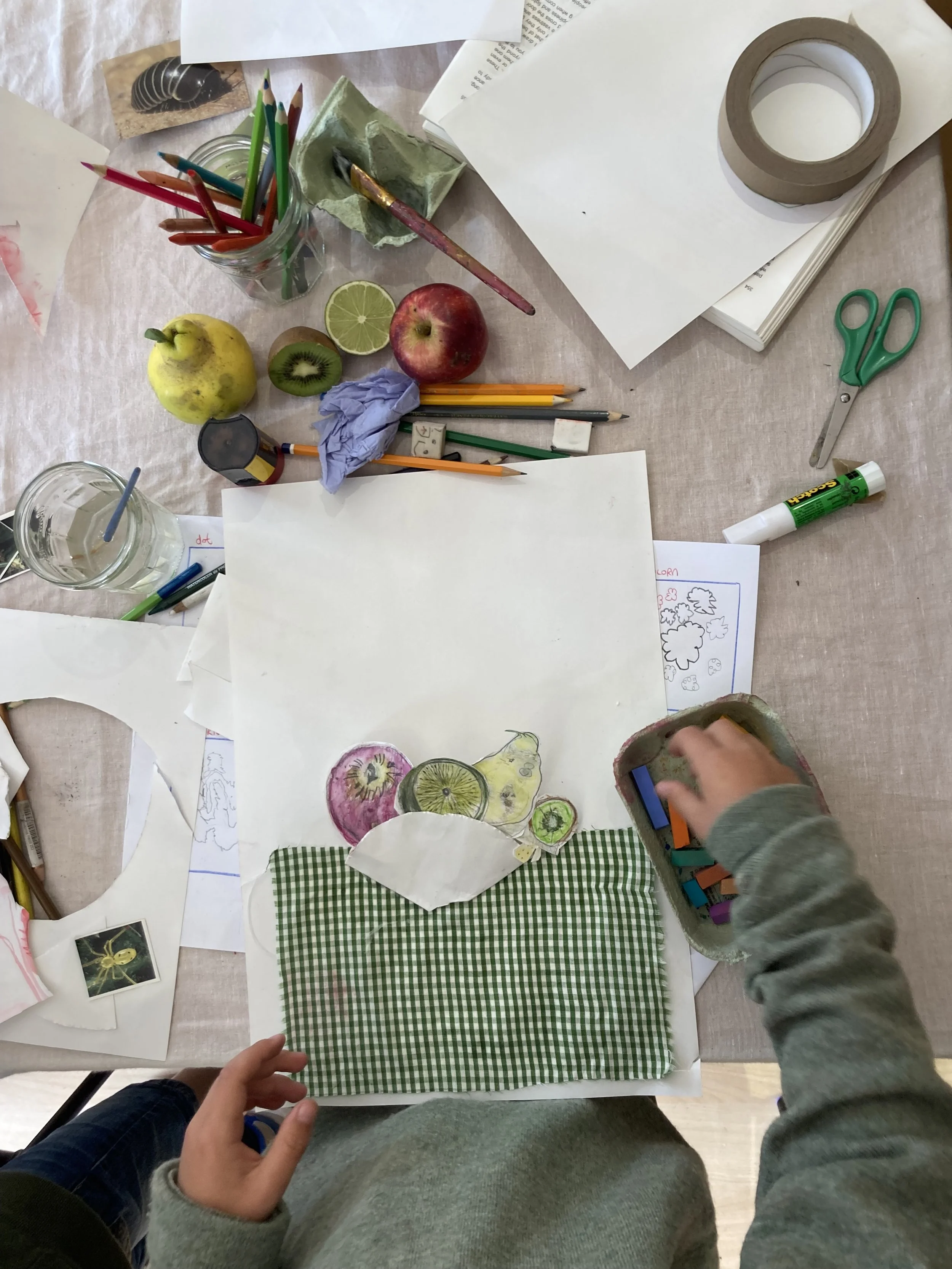 Table covered with art supplies, fruits, and papers, showing a child's hands working on a craft project with cutout images of fruits.