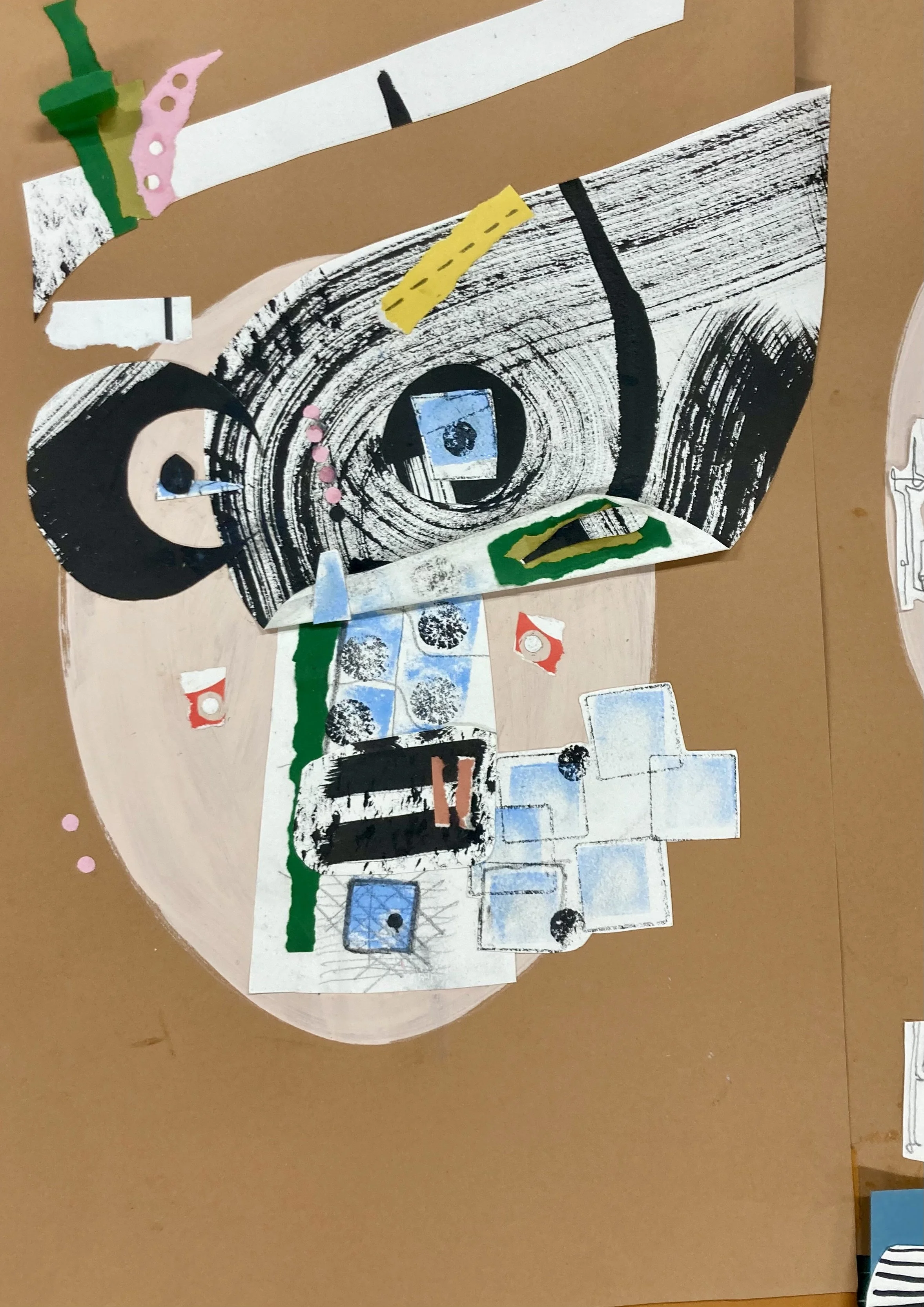 A collage artwork featuring various cut-out pieces including black and white abstract shapes, a blue circular background, with additional elements like a green and pink shape, a black rectangle with green dots, and text that says 'Stuck' in a stylize