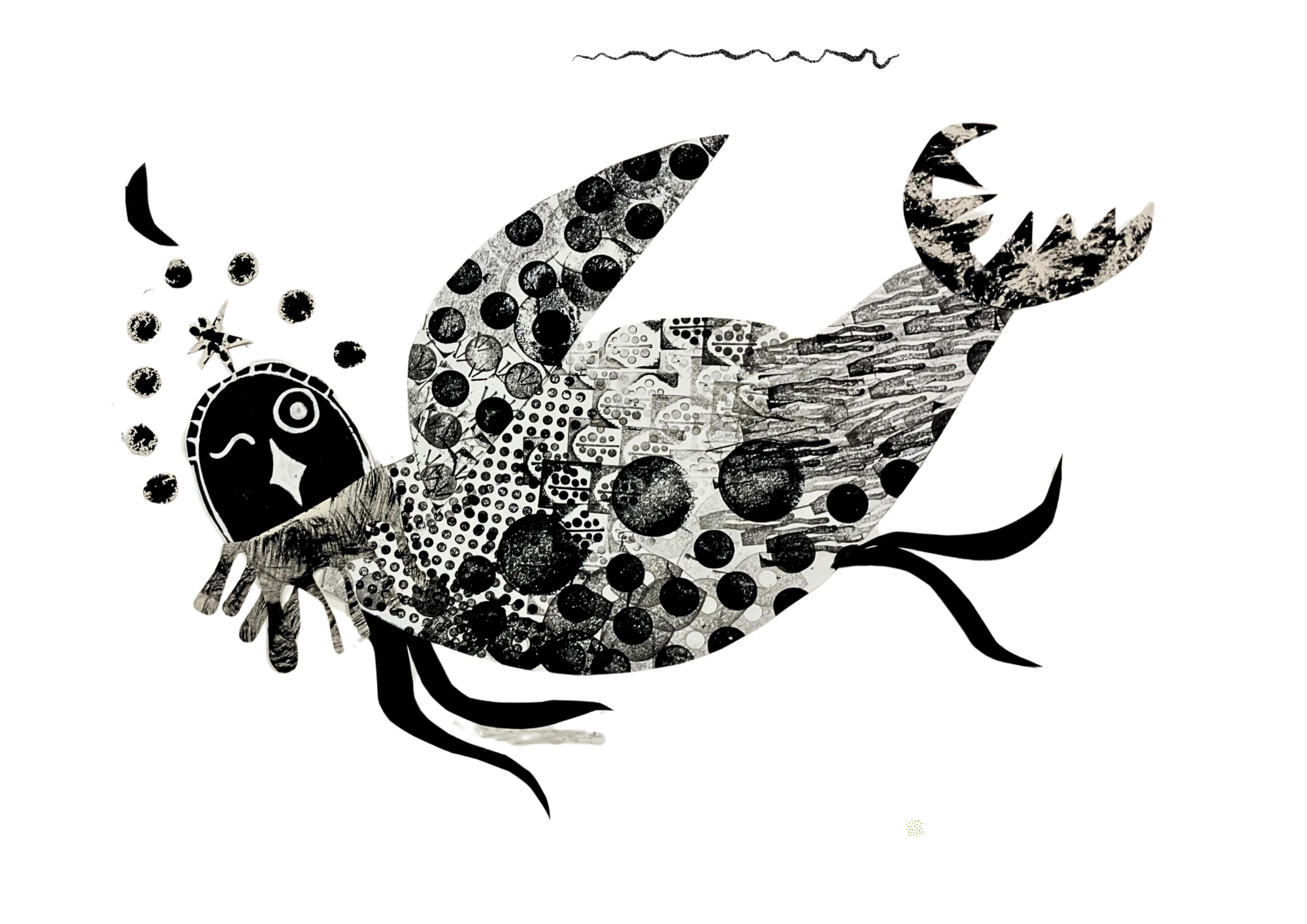 A collage art piece featuring a flamingo created from black and white printed images on a white background, with a colorful, abstractly painted leaf-shaped cutout attached below.