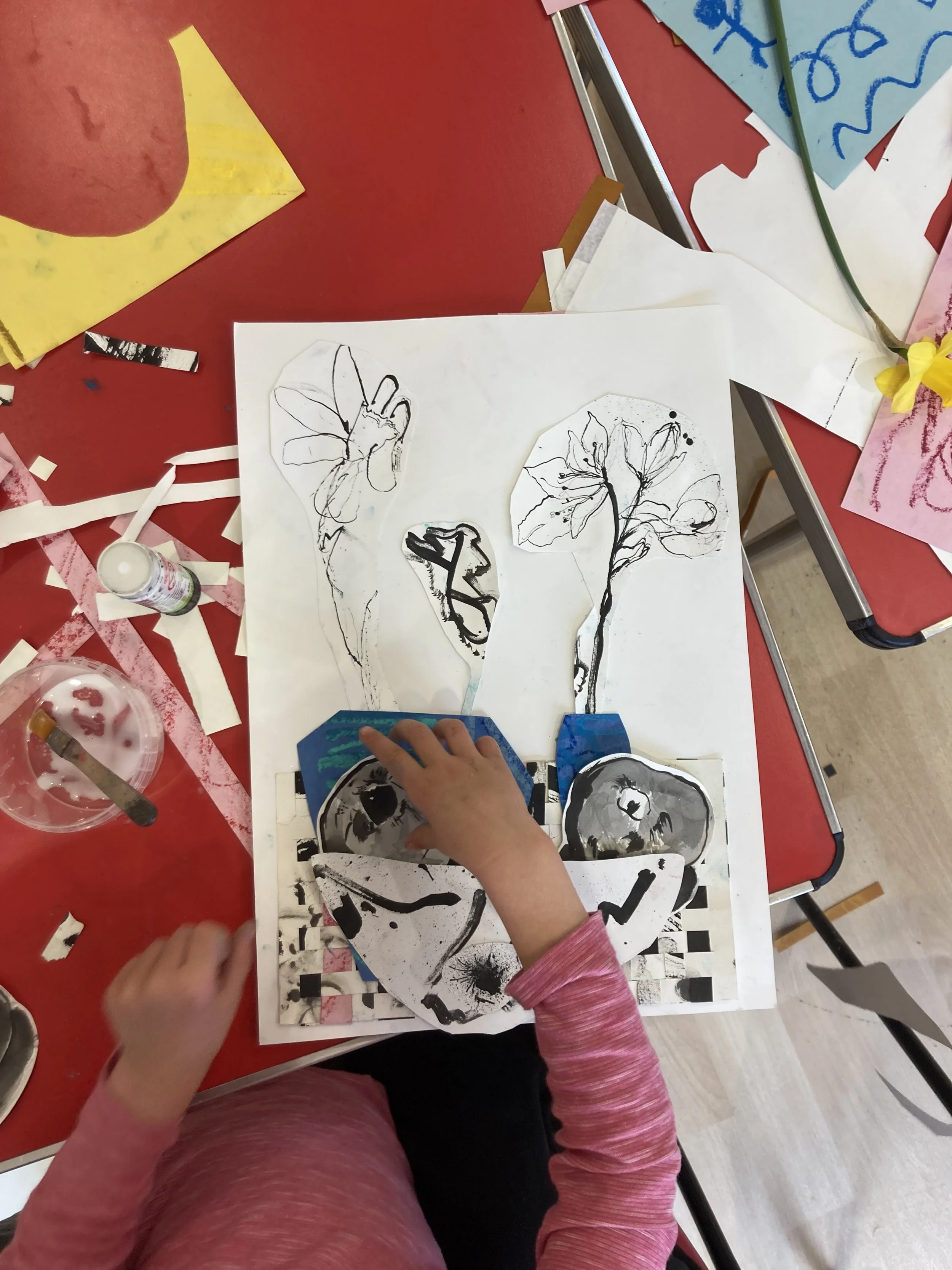 Child creating a mixed-media art collage of potted plants with drawings, paper cutouts, and painted elements on a white sheet, surrounded by art supplies on a red table.